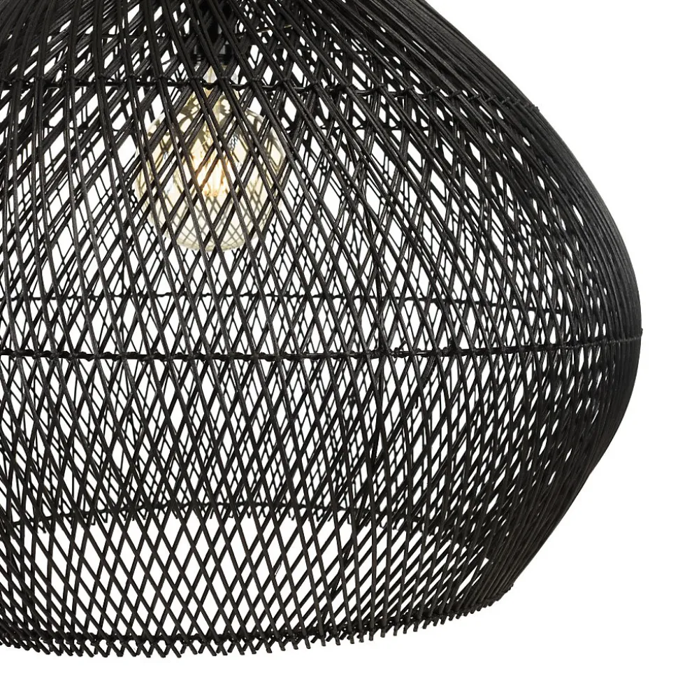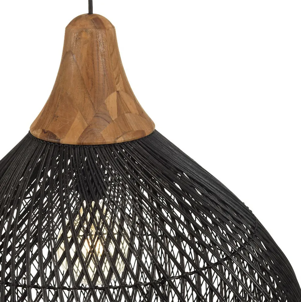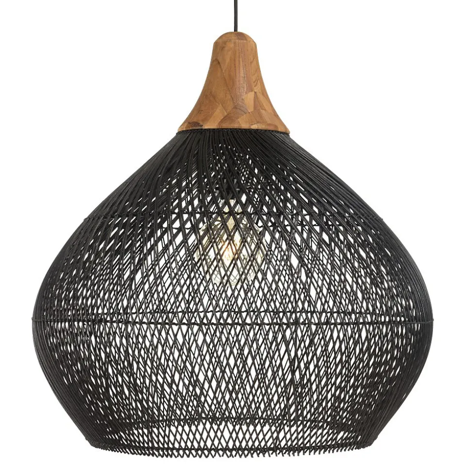 Suspension ‘cloche’ 68x68cm en rotin couleur noire et teck. Article en Rotin/Teck recyclé/Acier. Dimension 68 x 68 x 70 cm.