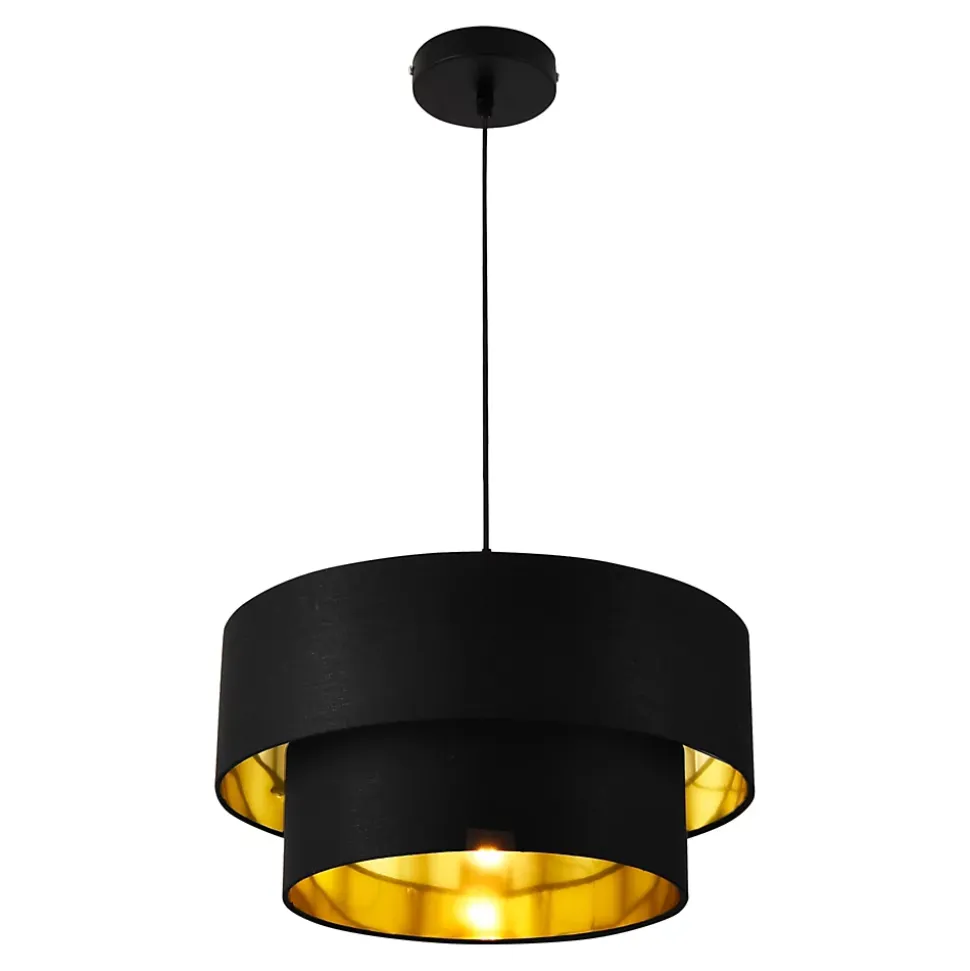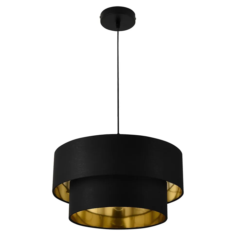 Suspension design Gâce à son apparance stylée, cette lampe à suspendre élégante et moderne embellira votre maison. Description : – suspension moderne et stylée pour l’intérieur – forme design – éclairage efficace Alimentation : 230V, 50Hz Type d’interrupteur : mural Douille : E27, max. 60W (le paquet à livrer ne contient pas d’ampoule)Matière : élément de fixation : métal l’abat-jour : textileCouleur : noir à l’extérieur, doré à l’intérieurDimensions : hauteur : ca. 149 cm avec le câble longueur du câble : ca. 125 cmdiamètre de l’abat-jour : ca. 40 cmdiamètre de l’élément de fixation au plafond : ca. 12 cm Contenu de la livraison : 1 x lampe à suspendre [sans ampoule] Produit de la marque [lux.pro].