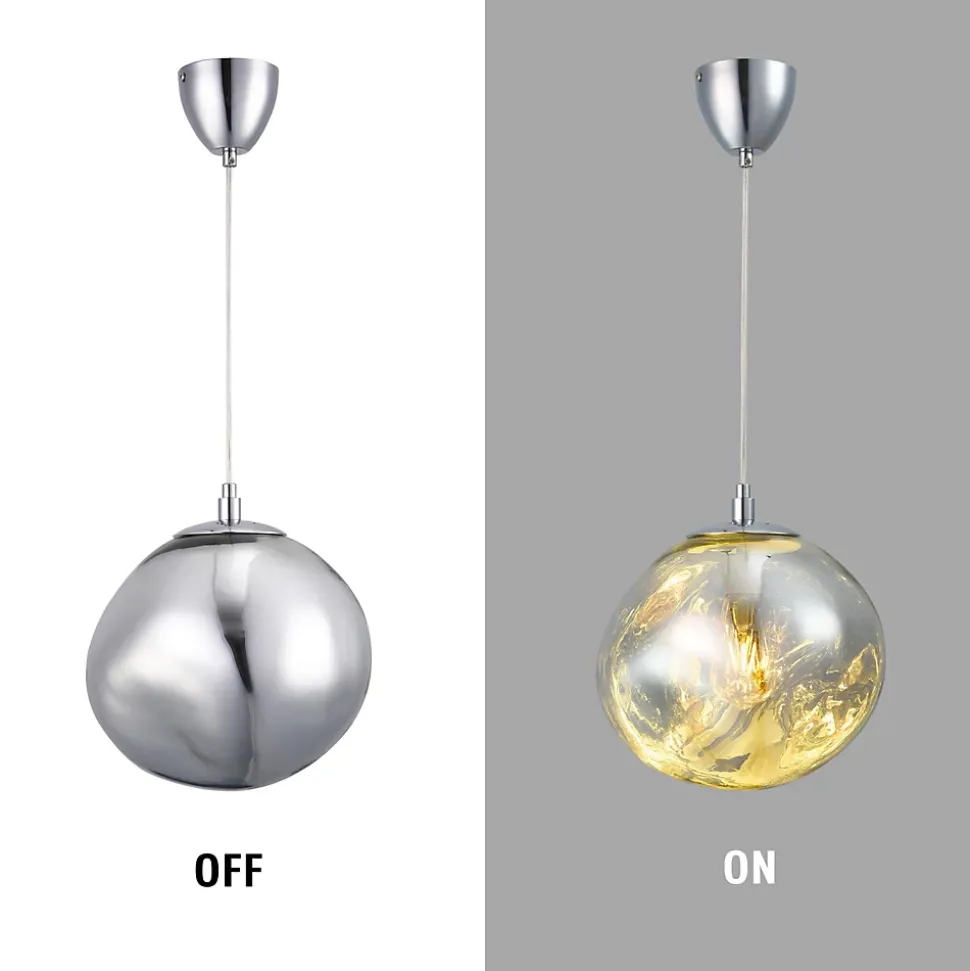 Suspension Design Moderne avec Abat-jour en Verre Métallisé Irrégulier Douille E27 Melti D360mmDesign Contemporain :Inspirée de la célèbre lampe Melt de Tom Dixon, la Melti allie élégance et modernité, se distinguant par un design contemporain incarnant innovation et créativité.Abat-jour en Verre Métallisé Irrégulier :Disponible en trois couleurs, son abat-jour en verre métallisé offre une apparence fluide et sculpturale, évoquant une transformation constante entre les états liquide et solide. Son effet visuel unique rappelle le verre fondu, apportant une esthétique sophistiquée et artistique.Construction et Détails :Dotée d’un floron et d’un support de suspension en métal, elle garantit durabilité et finition stylisée qui sublime son design exclusif.Compatibilité d’Ampoule :Compatible avec une ampoule E27 (non incluse), permettant de personnaliser l’éclairage pour créer des ambiances chaleureuses et modernes.Câble Ajustable en Hauteur :quipée d’un câble transparent réglable en hauteur, suspendu au plafond via un floron central, elle s’adapte facilement à différents espaces et besoins décoratifs.clairage Captivant :Grâce à son design distinctif et son éclairage captivant, la lampe Melti devient un point central dans tout espace intérieur, idéale pour créer des environnements stylés et uniques.Spécifications lectriques :Tension nominale : 220-240V ACPuissance maximale : 40WDouille : E27Indice de protection : IP20 (Utilisation intérieure)Couleurs Disponibles :DoréChroméDoré RoséDimensions :Diamètre : 360 mmHauteur : 300 mmLongueur du Câble : 1320 mm