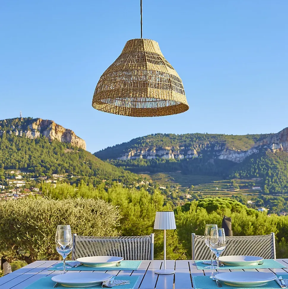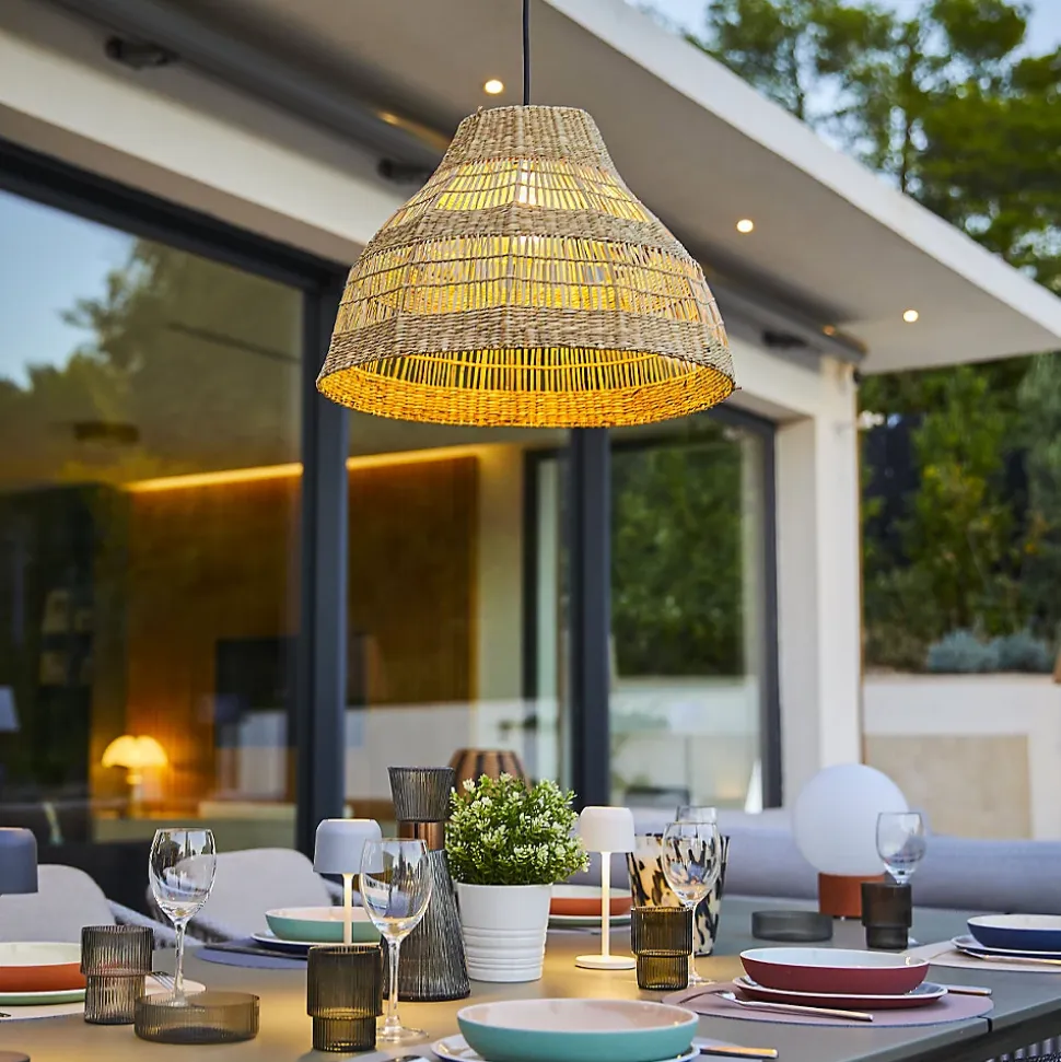 ABAT-JOUR EN HERBE MARINE : La suspension MERIDA OUTDOOR CABLE, issue de l’artisanat, est fabriquée en herbe marine. L’herbe marine est une fibre végétale très résistante. C’est un matériau à la fois souple et rigide qui permet une multitude de formes. Exotique et chaleureuse, elle mettra en lumière un intérieur moderne et va s’adapter parfaitement à un style plus bohème ou vintage grâce à son look ethnique chic. Son tressage unique va sublimer votre espace de vie. Dimensions : 48 x 48 x 34 cmCÂBLE AVEC DOUILLE E27 : La suspension MERIDA OUTDOOR CABLE est équipée d’un câble pour l’extérieur d’une longueur confortable de 5 mètres. Suspendez-la sur une branche d’arbre, sous un parasol ou encore une pergola, pour créer une ambiance lumineuse chaleureuse sur votre terrasse ou dans votre jardin. Branchement sur secteur 220-240V. UTILISATION EXTÉRIEUR : La suspension MERIDA OUTDOOR CABLE est conçue pour une utilisation en extérieur grâce à son indice de protection IP64 qui lui permet d’être protégée contre les projections d’eau de toutes directions.