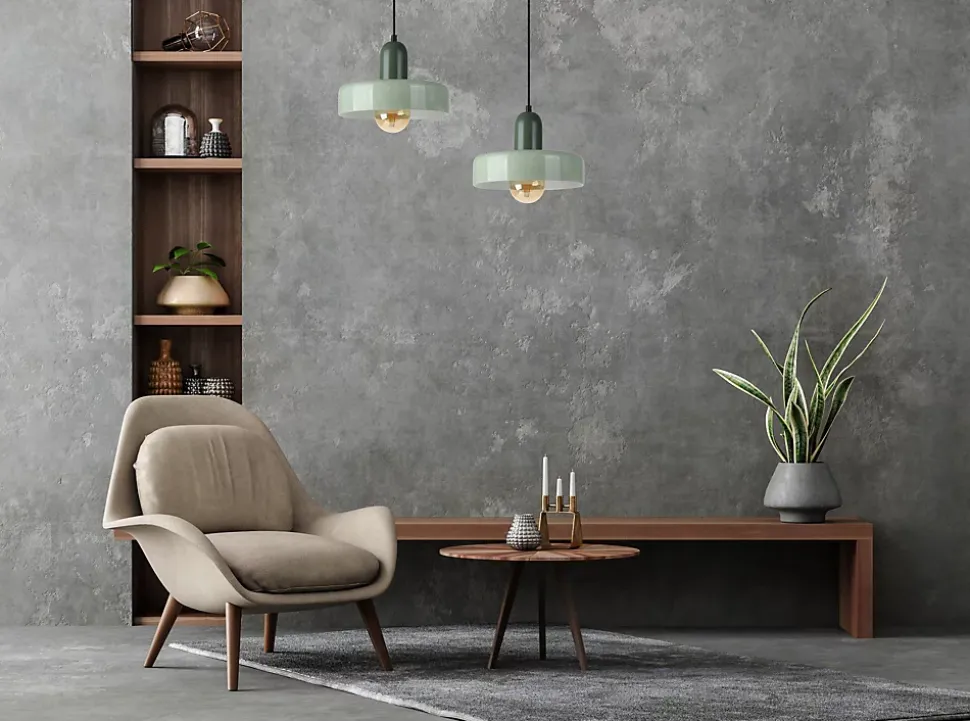- Son verre délicatement teinté de deux nuances de vert crée une lumière subtile et raffinée, parfaite pour une ambiance rétro-chic.