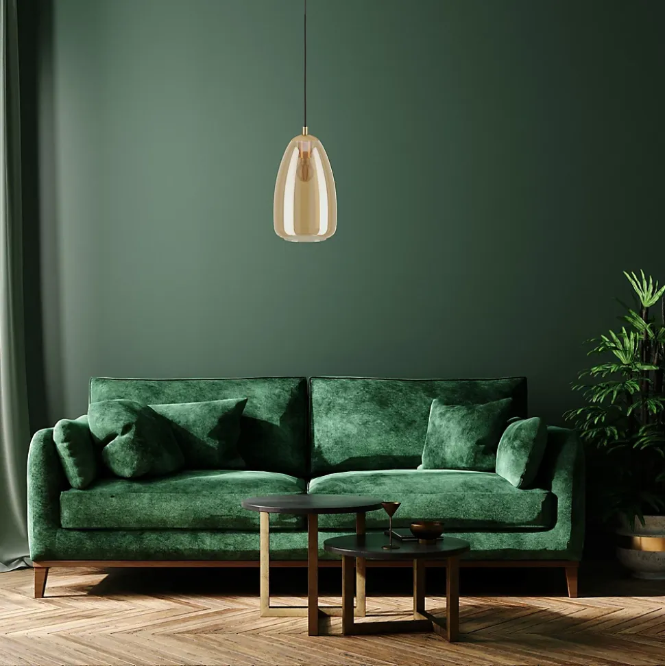 - Cette suspension en verre ambrée et avec sa finition en métal doré située au dessus de l’abat jour mais aussi avec son pavillon doré apportera une touche d’élégance à votre intérieur.
