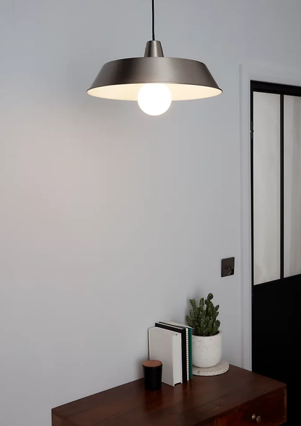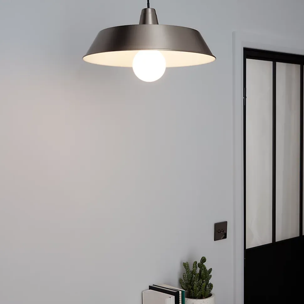 Nos suspensions ont été conçues dans un certain nombre de formes, de matières et de finitions pour vous permettre de trouver facilement celle qui vous convient. Cette suspension argentée peut parfaitement servir de source de lumière principale