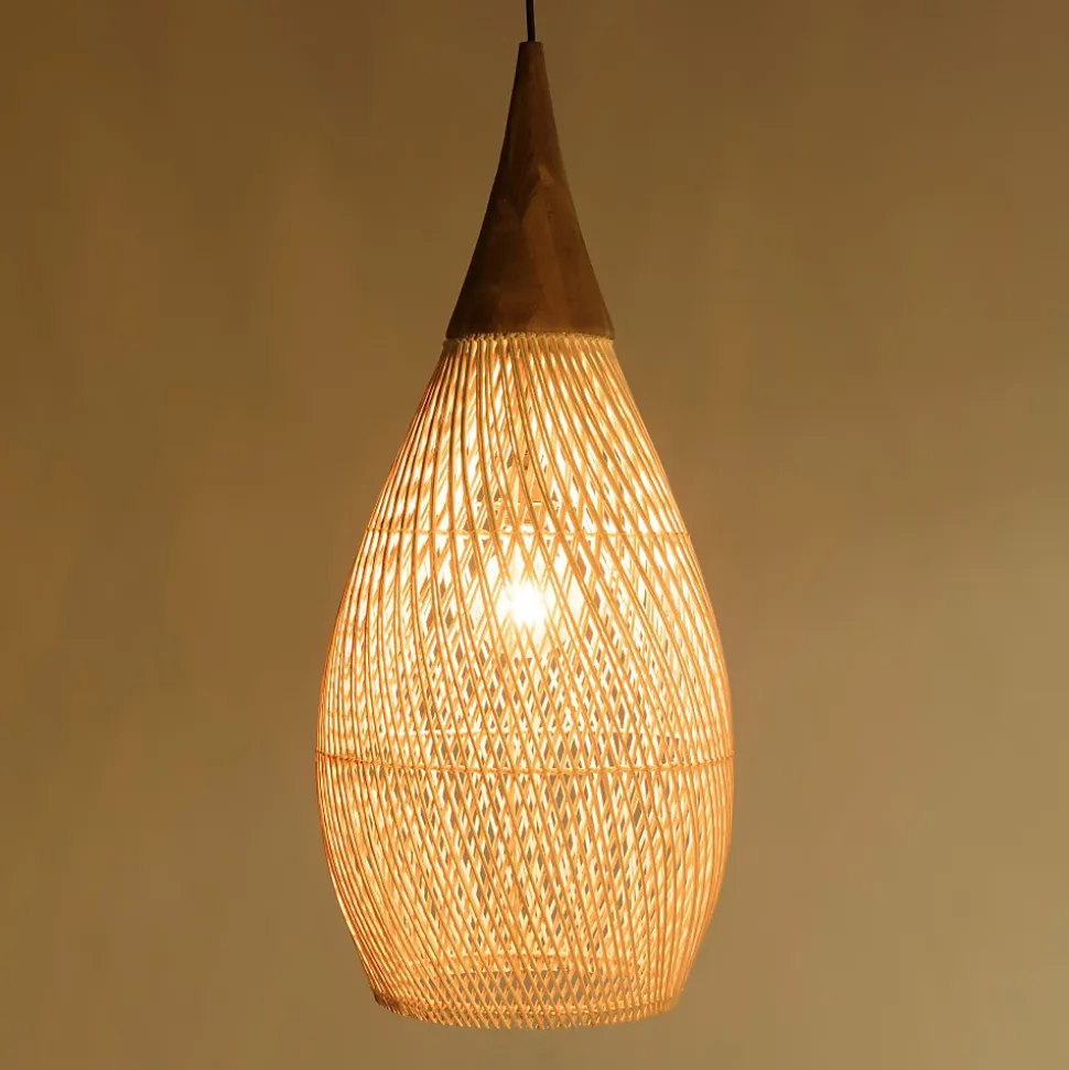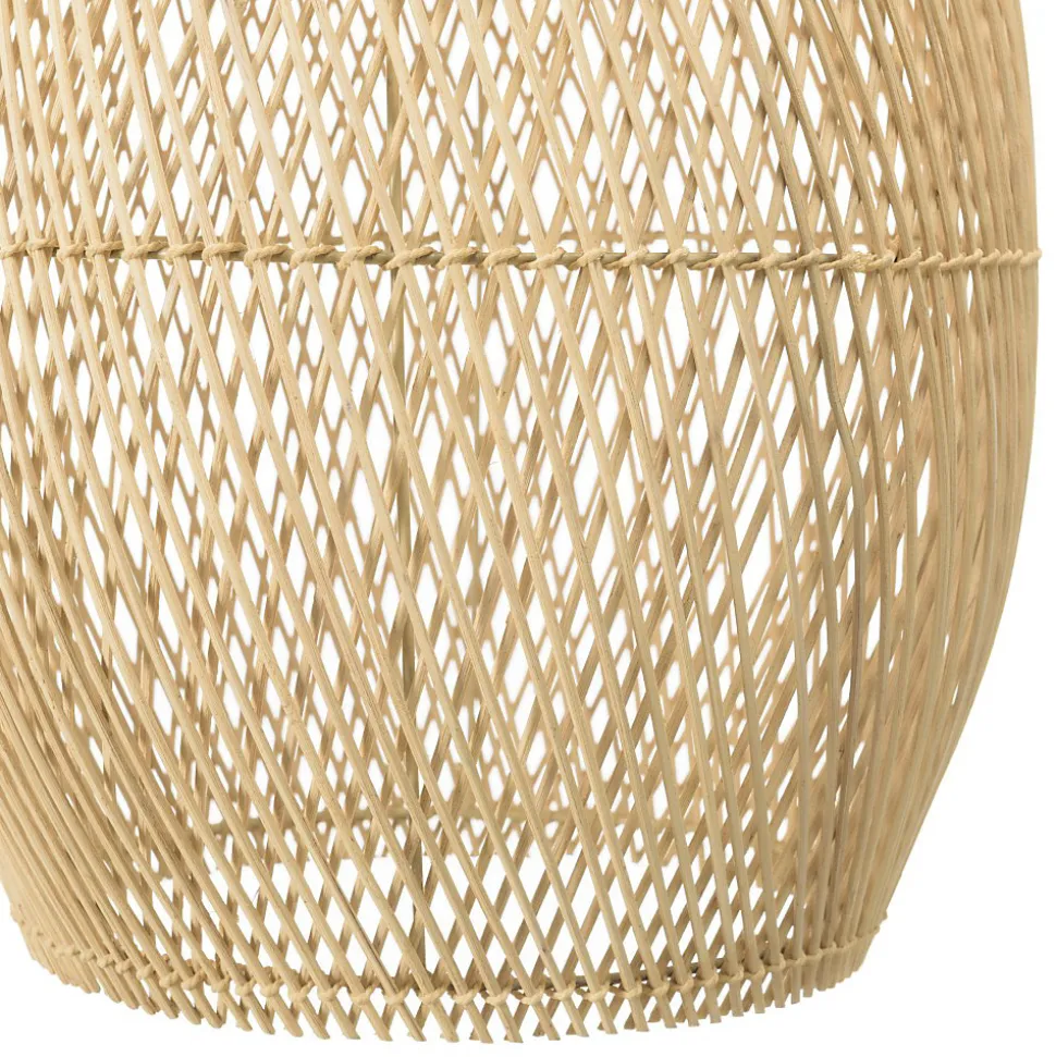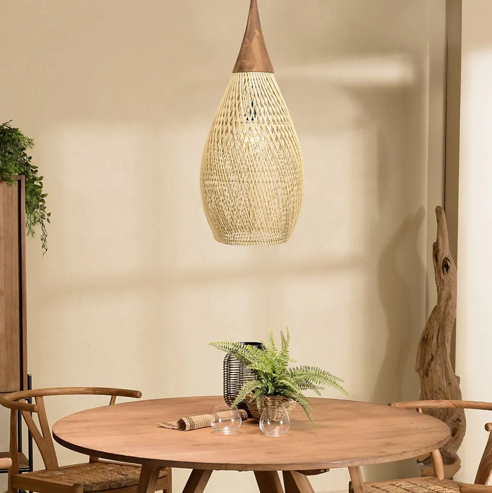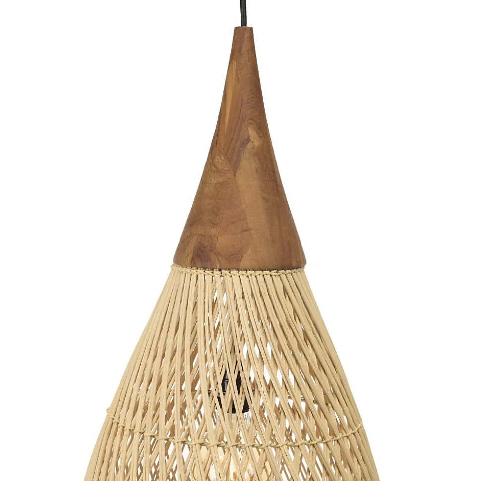 Suspension ‘goutte’ 35x35cm rotin couleur naturelle et teck. Article en Rotin/Teck recyclé/Acier. Dimension 35 x 35 x 83 cm.