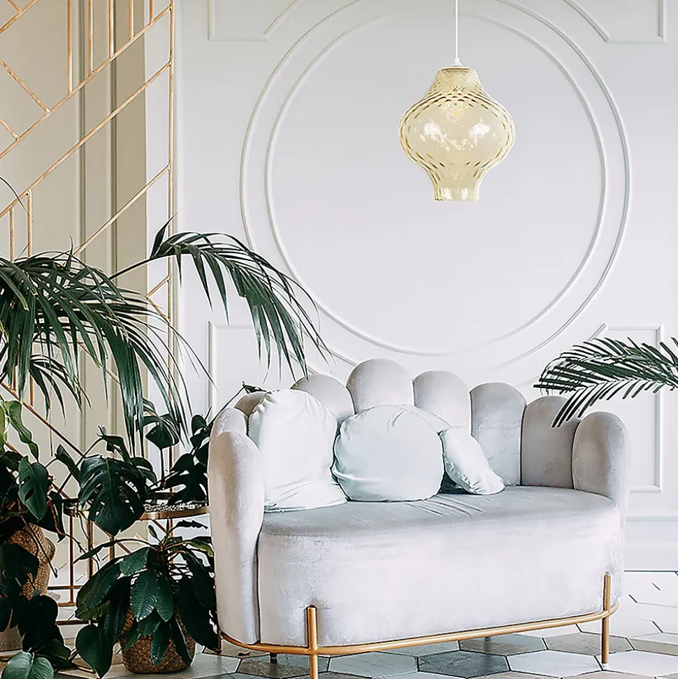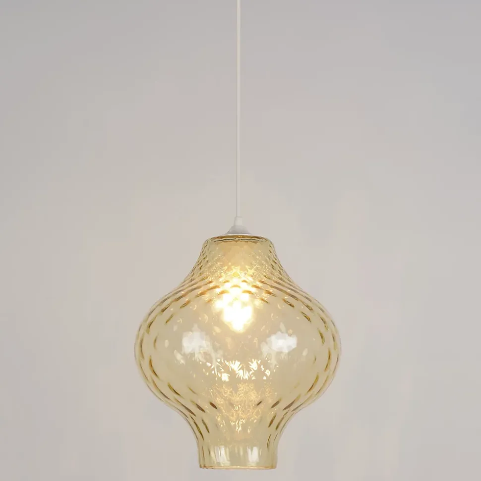 Suspension en verre relief strié équipée d’un cordon plastique blanc. Coloris : ambre. IP20. D30cm – HT110cm. Classe 2. E27-60W.