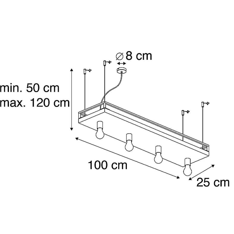 Envie de donner à votre livre de cuisine préféré, à vos magazines, à vos plantes ou à vos herbes un endroit cool ? Avec la suspension industrielle tendance Shelf, les options de décoration sont infinies. Cette suspension mesure 100 cm de long, 25 cm de large et sa hauteur est réglable de 50 cm minimum à 120 cm maximum. La plaque de montage a un diamètre de 8 cm et une hauteur de 2,5 cm. Le cordon inclus mesure 103,5 cm de long. Vous pouvez compléter cette suspension avec quatre ampoules E27, chacune d’une puissance maximale de 60 watts. Ce luminaire peut également être atténué à l’aide d’un variateur externe. Les sources lumineuses et le variateur ne sont pas inclus. Cette suspension est idéale pour un éclairage d’ambiance et de base dans votre cuisine, votre salle à manger ou votre salon. Créez votre propre style et une ambiance unique avec la suspension Shelf !