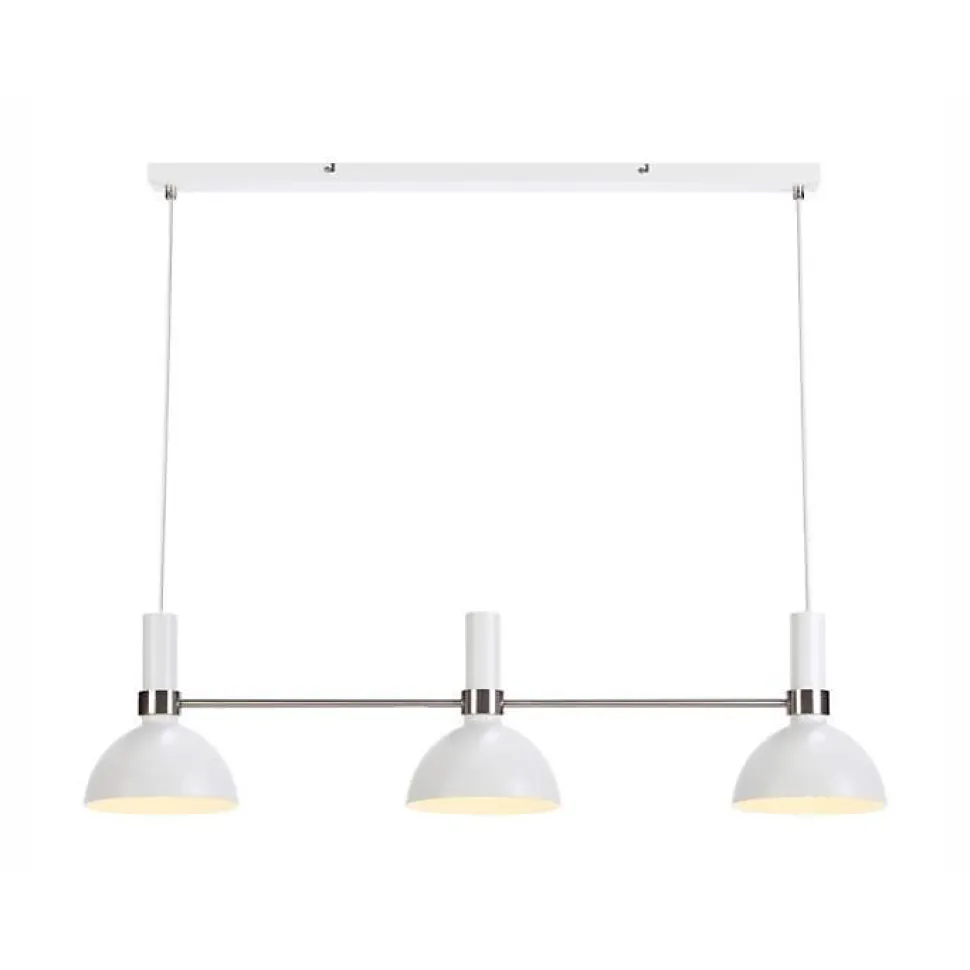 Les caractéristiques techniquesCette suspension lumineuse en métal laqué blanc mat fonctionne avec 3 ampoules GU10 35 watts maximum, non fournies, ce qui vous offre l’opportunité de choisir température de couleur et intensité lumineuse en fonction de vos goûts et besoins.Les avantages esthétiquesLa suspension MarkSlöjd Larry a été imaginée par la designeuse néerlandaise Monika Mulder. Diplômée de la Design Academy de Eindhoven, elle a effectué son stage de fin d’études chez Ikea avant de créer sa propre agence où elle a comme clients Ikea et MarkSlöjd entre autres.Pour sa suspension Larry blanche chromée 3 points lumineux, la créatrice a adopté un parti pris minimaliste et une esthétique sobre qui lui permet de s’intégrer à tout type de décoration mais convient notamment à un intérieur contemporain, design ou industriel.Cette suspension est composée de 3 abat-jour alignés et trouvera particulièrement sa place au-dessus d’un bar, de l’îlot central de votre cuisine ou d’une grande table rectangulaire.Pour un usage professionnel, vous installerez cette élégante suspension au-dessus d’un bar ou dans une salle de restaurant.La suspension Larry 3 point lumineux fonctionne avec 3 ampoules E27, non fournies.Elle existe en noir et chrome, noir et laiton doré ou blanc et chrome.