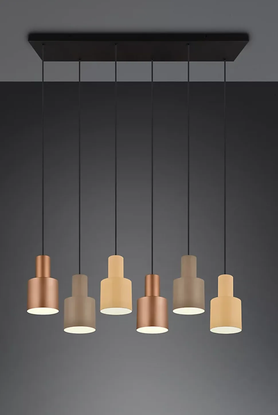 Les caractéristiques techniquesLa Suspension AGUDO de Trio se distingue par son design moderne et minimaliste. Elle est équipée de six abat-jours en métal de couleurs naturelles (taupe, beige et café), offrant une combinaison de hauteurs différentes pour un effet visuel unique. Cette suspension est parfaite pour apporter une touche d’élégance au-dessus de votre table de salle à manger ou dans votre salon.Réglable en hauteur, elle permet un montage facile au plafond, s’intégrant ainsi harmonieusement à votre intérieur. Le corps en métal de cette suspension est fini dans une teinte mate pour un look chic et moderne.Les avantages esthétiquesLa combinaison des abat-jours en métal et des couleurs naturelles créera une ambiance chaleureuse et accueillante dans votre pièce. Grâce à son design épuré, cette suspension peut être utilisée aussi bien dans des intérieurs modernes que dans des décors plus traditionnels, tout en offrant une lumière douce et agréable.Conseils d’installation et utilisationLa Suspension AGUDO est idéale pour illuminer vos espaces de manière pratique et élégante. L’installation est rapide grâce à son système de suspension au plafond et sa conception légère. Pour une ambiance chaleureuse, nous vous recommandons d’opter pour des ampoules LED à lumière chaude.