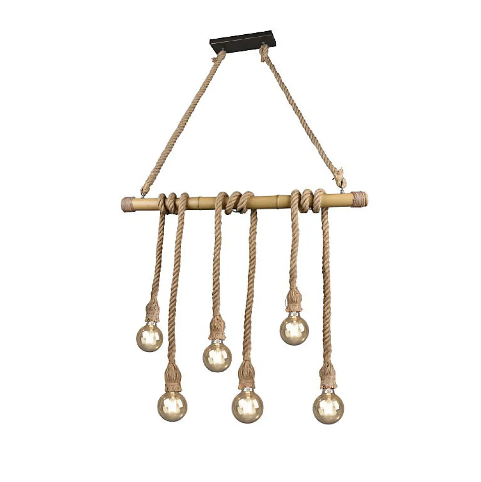 Les caractéristiques techniquesLa suspension Led Wilma est constituée d’une rosace en métal noir mat, d’une barre en bambou et de câbles de suspension en corde de sisal réglables en hauteur.Vous pourrez y adapter 6 ampoules Led culot E27 d’une puissance maximale de 10 watts chacune. A vous de choisir leur intensité et leur température de couleur afin de définir l’ambiance que vous souhaitez.De par ses dimensions imposantes (1,50 m de haut pour 1 m de largeur) , ce luminaire conviendra plus particulièrement à une vaste pièce avec grande hauteur sous plafond.Les avantages esthétiques Ce magnifique luminaire de grande dimension a été conçu par les designers de la maison Trio dans l’esprit actuel de matériaux naturels, très tendance en ce moment.Avec sa barre en bambou et ses suspensions en corde de sisal, il conviendra particulièrement dans un intérieur contemporain ou rustique et une vaste pièce haute de plafond.Il trouvera sa place dans votre salle à manger au dessus d’une grande table rectangulaire où sa longueur de 1 mètre permettra à tous les convives d’être efficacement éclairés ou dans un salon cathédrale.Afin de renforcer l’originalité de ce lustre, nous vous conseillons de l’équiper d’ampoules à filament. Si vous voulez créer une suspension unique, vous pouvez installer des ampoules de designs différents.