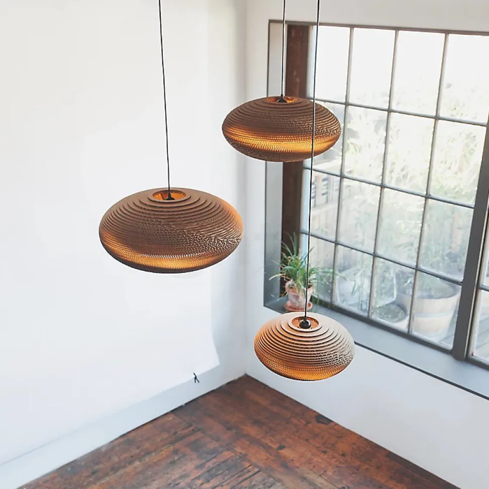 Les caractéristiques techniquesCette suspension est composée d’une rosace de plafond en métal laqué noir, d’un câble de suspension haut de gamme en textile noir et d’un abat-jour en lamelles de carton local recyclé assemblées à la main. Un processus de fabrication innovant et unique en garantit la durabilité et la solidité.Dimension de la suspension : hauteur de 19 ou 26 cm, diamètre de 43 ou 61 cm et le câble textile de 2 m (réglable).Les produits utilisés (adhésif et produit ignifuge) sont garantis non-toxiques.Ce luminaire fonctionne avec une ampoule E27 de 40 watts maximum, non fournie, ce qui vous permet de choisir température de couleur et intensité lumineuse en fonction de vos goûts.Les avantages esthétiquesSeth Grizzle et Jonathan Junker, fondateurs de Graypants ont imaginé pour vous cette suspension en carton recyclé.L’esthétique minimaliste de ce lustre de forme disque se marie harmonieusement avec une décoration contemporaine épurée.La lumière projetée au travers des ondulations du carton produit un éclairage chaleureux et intime.Vous pourrez installer la Suspension Disc16 dans votre pièce à vivre, au-dessus de l’îlot central de votre cuisine, dans un bar ou une salle de restaurant.Si vous placez plusieurs suspensions dans la même pièce, vous pourrez jouer sur différentes hauteurs et formes pour créer l’originalité.Chaque produit Graypants est fabriqué à la main et estampillé du prénom de la personne qui l’a assemblé.Le processus de fabrication unique fait de chaque luminaire une pièce exceptionnelle.Dans le cadre d’une démarche économique de qualité et de solidarité, les luminaires Graypants sont fabriqués aux Pays-Bas par des personnes à capacité réduite. Le carton utilisé est collecté localement.