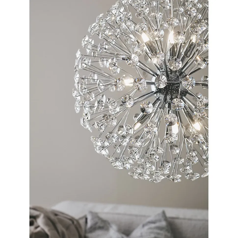 Les caractéristiques techniquesLa suspension Bolid est composée de tiges et d’une rosace en métal chromé, de cabochons en cristal et d’un câble de suspension en acier.Elle fonctionne avec 9 ampoules G9, non fournies, ce qui vous permet de choisir intensité lumineuse et température de couleur en fonction de vos goûts et besoins.Les avantages esthétiquesLa suspension Bolid sera la star de la pièce qu’elle illuminera de mille feux .Avec ses cabochons en véritable cristal, elle constitue la parfaite version moderne des lustres baroques d’antan et s’accordera aussi bien à une décoration de style qu’à un intérieur contempooirain pour y apporter une touche décalée.Elle convient particulièrement à une pièce de grandes dimensions ou avec une importante hauteur sous plafond (appartement haussmanien, salon ou entrée cathédrale)