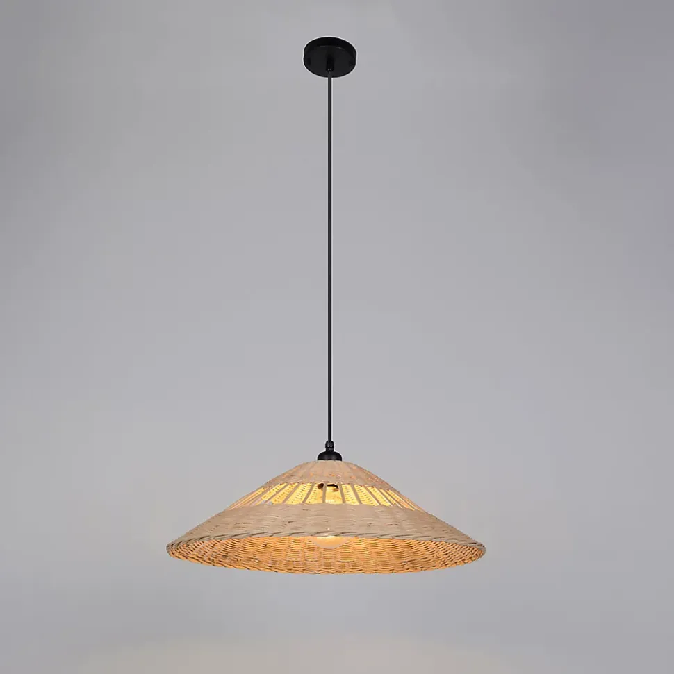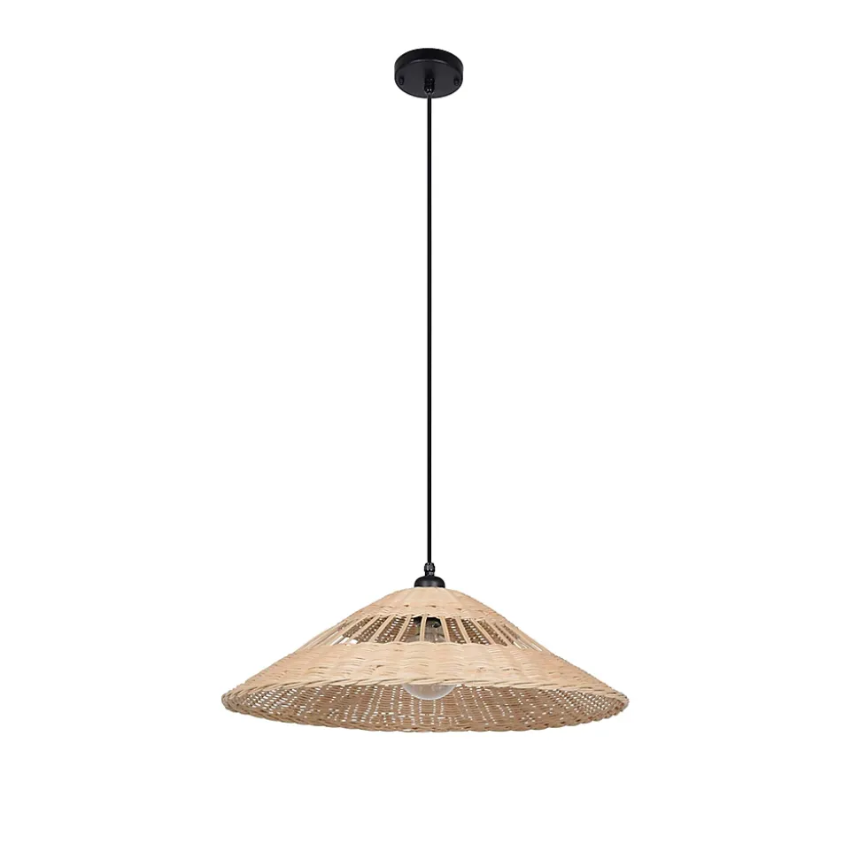 Suspension forme conique en rotin tressé finition vernis marin. Equipée d’un cordon outdoor avec pavillon en métal peint. Coloris : naturel. IP44. D56cm – H16cm – HT96cm. Classe 1. E27-15W.