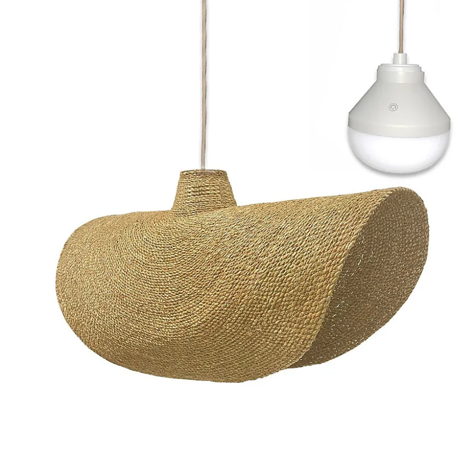 La suspension artisanale Kleia Nomad est fabriquée en herbe marine trèssée offrant un design majestueux de 90 cm de diamètre pour 13 cm de hauteur. Livrée avec l’ampoule LED autonome Lys, elle diffuse une lumière blanc chaud ou multicolore RGB réglable par télécommande. Son système magnétique innovant permet de la suspendre librement partout sans aucun raccordement électrique fixe, offrant une autonomie technique de 12 heures. Certifiée IP64, elle résiste aux projections d’eau pour un usage extérieur sous une pergola ou un salon de jardin. L’herbe marine est une fibre résistante conçue pour durer saison après saison sans dégradation structurelle. Maintenez l’abat-jour au sec. Les lignes équilibrées et les proportions étudiées apportent une présence élégante, sans surcharger la pièce.