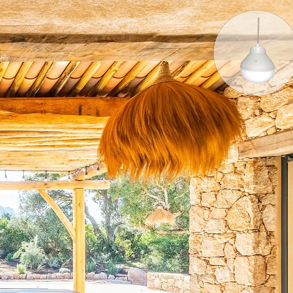 La suspension artisanale Big Masai Nomad est fabriquée à partir d’herbe de rayung séchée offrant un design exotique et majestueux de 80 cm de diamètre pour 62 cm de hauteur. Livrée avec l’ampoule LED autonome Lys, elle propose un éclairage blanc chaud et multicolore RGB ajustable par télécommande. Grâce à son système magnétique sans fil, elle se suspend n’importe où sans aucun besoin de raccordement électrique, offrant une autonomie technique de 11 heures. Certifiée IP44, elle résiste aux projections d’eau pour un usage extérieur durable sous une pergola ou une véranda. Le cordage naturel est reconnu pour sa solidité et sa résistance aux conditions extérieures variées. Maintenez l’abat-jour au sec. Parfaite pour les repas en plein air, les apéritifs ou les soirées d’été, elle crée immédiatement une ambiance douce et accueillante.