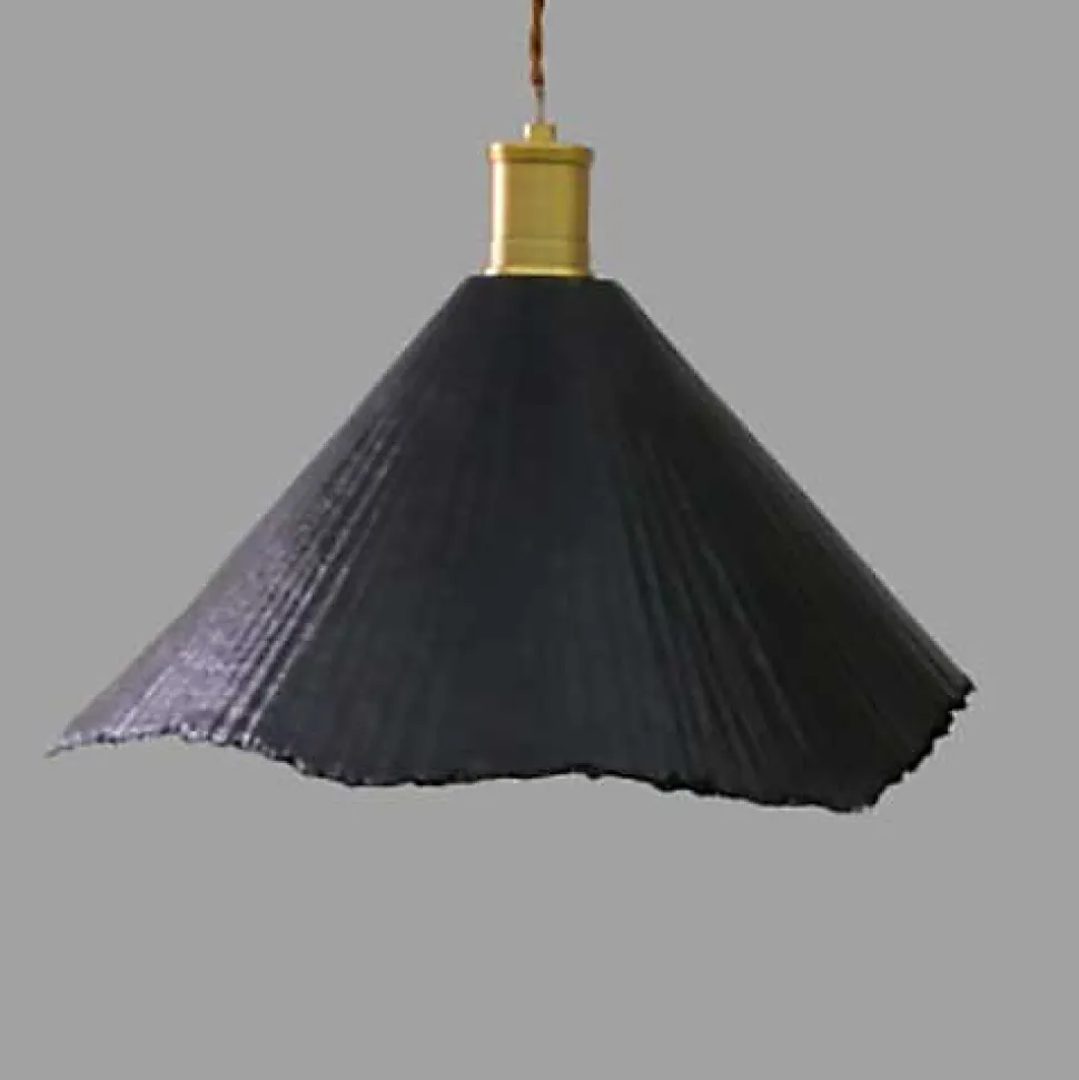 Suspension Sam conique en papier gaufré noir D36cm électrifiée Ce superbe abat-jour en papier mâché est poétique grâce à sa découpe asymétrique et sa matière qui laisse passer délicatement la lumière. Cette suspension est faite à la main, son côté très aérien est superbe. D36cm x H20cm Ce luminaire est livré électrifié, il se compose d’une douille dorée E27, d’un abat-jour, d’un câble électrique torsadé ocre et d’une rosace de plafond en métal noir. Les bords de l’abat-jour sont irréguliers. Existe aussi en Diamètre 30cm : abat jour cône en papier Découvrez le reste de la gamme suspension >> toutes nos suspensions en papier maché