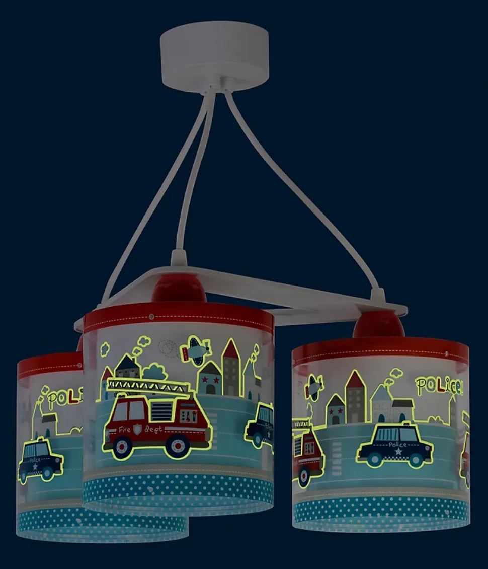 Acheter le lustre pour enfant à 3 lumières PoliceObtenez un éclairage supplémentaire avec le lustre pour enfant à 3 lumières, avec des voitures de police et des camions de pompiers. Il est doté d’un double écran en polypropylène transparent, d’un diffuseur de lumière inférieur pour éviter l’éblouissement, et d’un effet de fluorescence : il brille dans le noir pendant quelques minutes ! Il est également réglable en hauteur, il s’adaptera donc parfaitement à la chambre des enfants