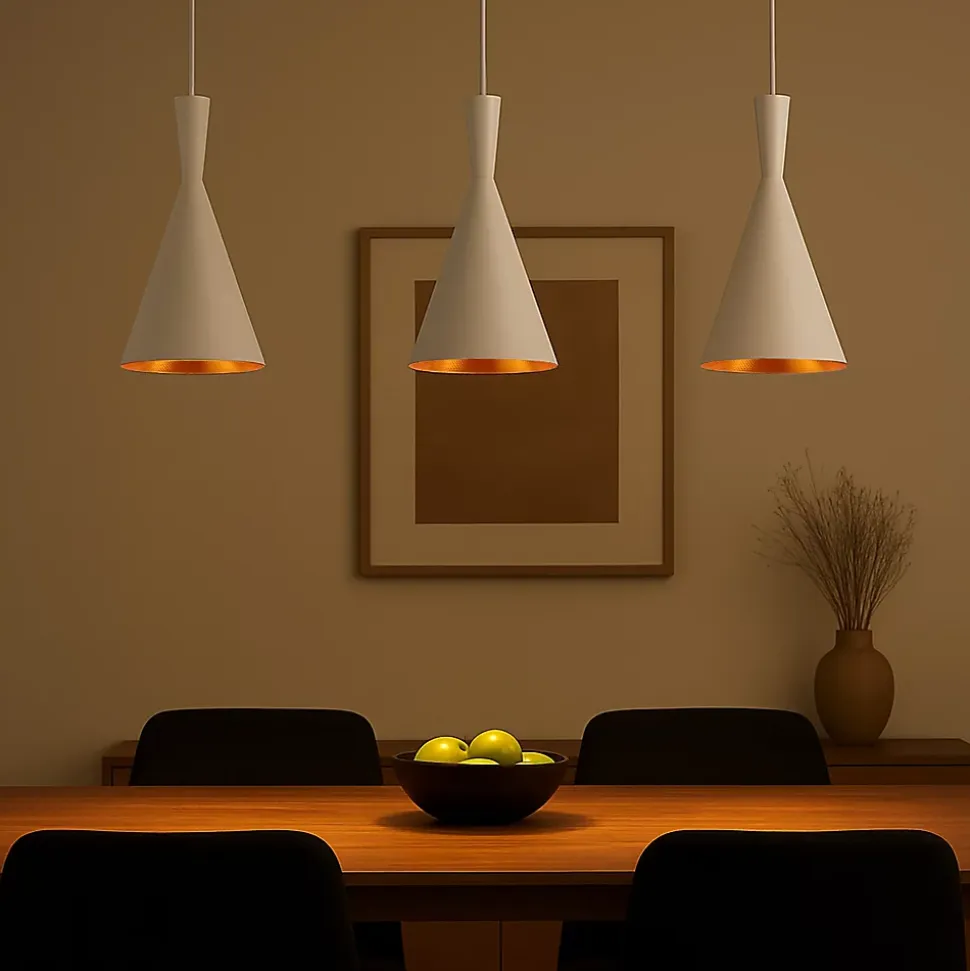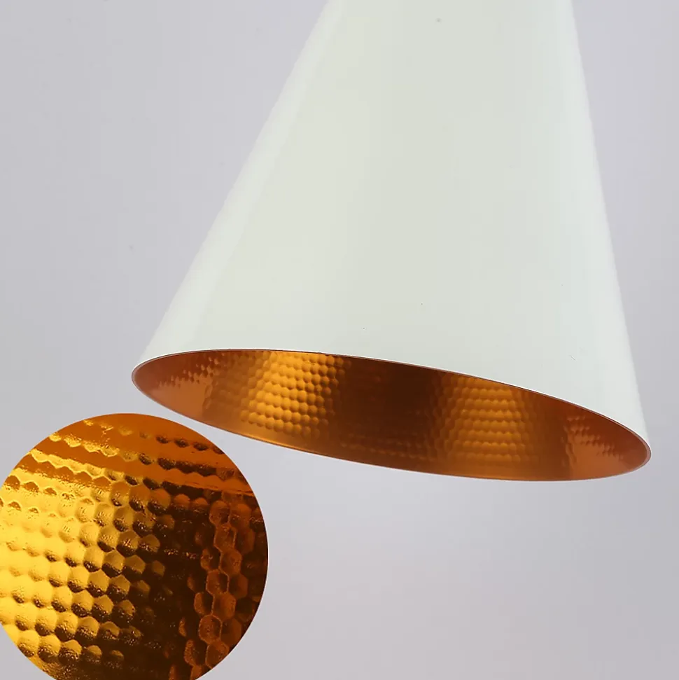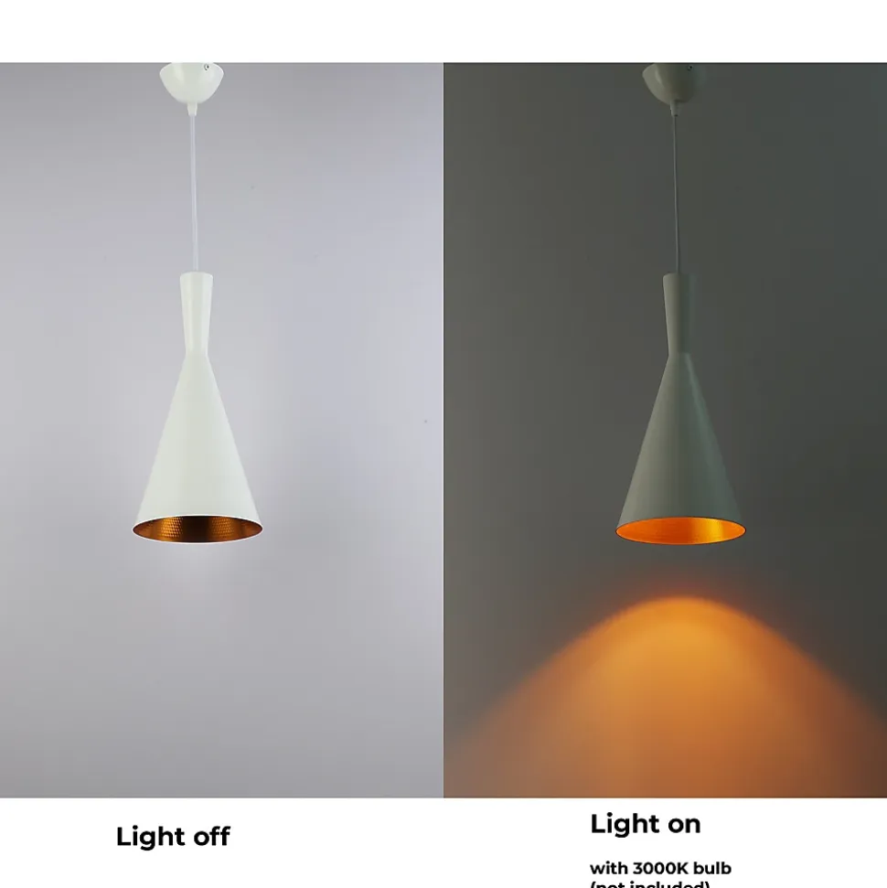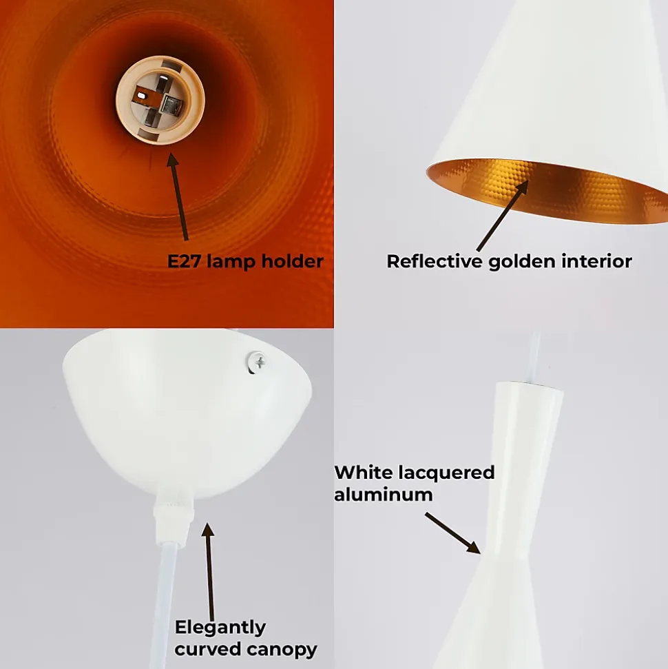 La suspension « CONICA », fabriquée en aluminium avec des finitions de haute qualité, se distingue par son design nordique élégant. Disponible en 2 couleurs, elle possède un intérieur doré qui reflète la lumière de manière subtile et chaleureuse.Parfaite au-dessus dune table de salle à manger, dans un salon, une cuisine ou dans des environnements commerciaux tels que restaurants et cafés.Dotée dun abat-jour en aluminium au fini mat, disponible en 6 couleurs pour sadapter à tous les styles. Installation facile avec tous les éléments inclus.Fonctionne avec une ampoule LED E27 (non incluse) et un câble de 1,3 m réglable en hauteur depuis le pavillon.Un choix sophistiqué pour ajouter une touche délégance contemporaine à votre intérieur.Caractéristiques principales :Matériau : AluminiumAmpoule : 1 x E27 (non incluse)Puissance max. : 40WCouleurs : blanc, noirTension : 220-240 V ACIP20 : usage intérieurDimensions : Ø180 x 380 mmCâble : 1300 mm (réglable)