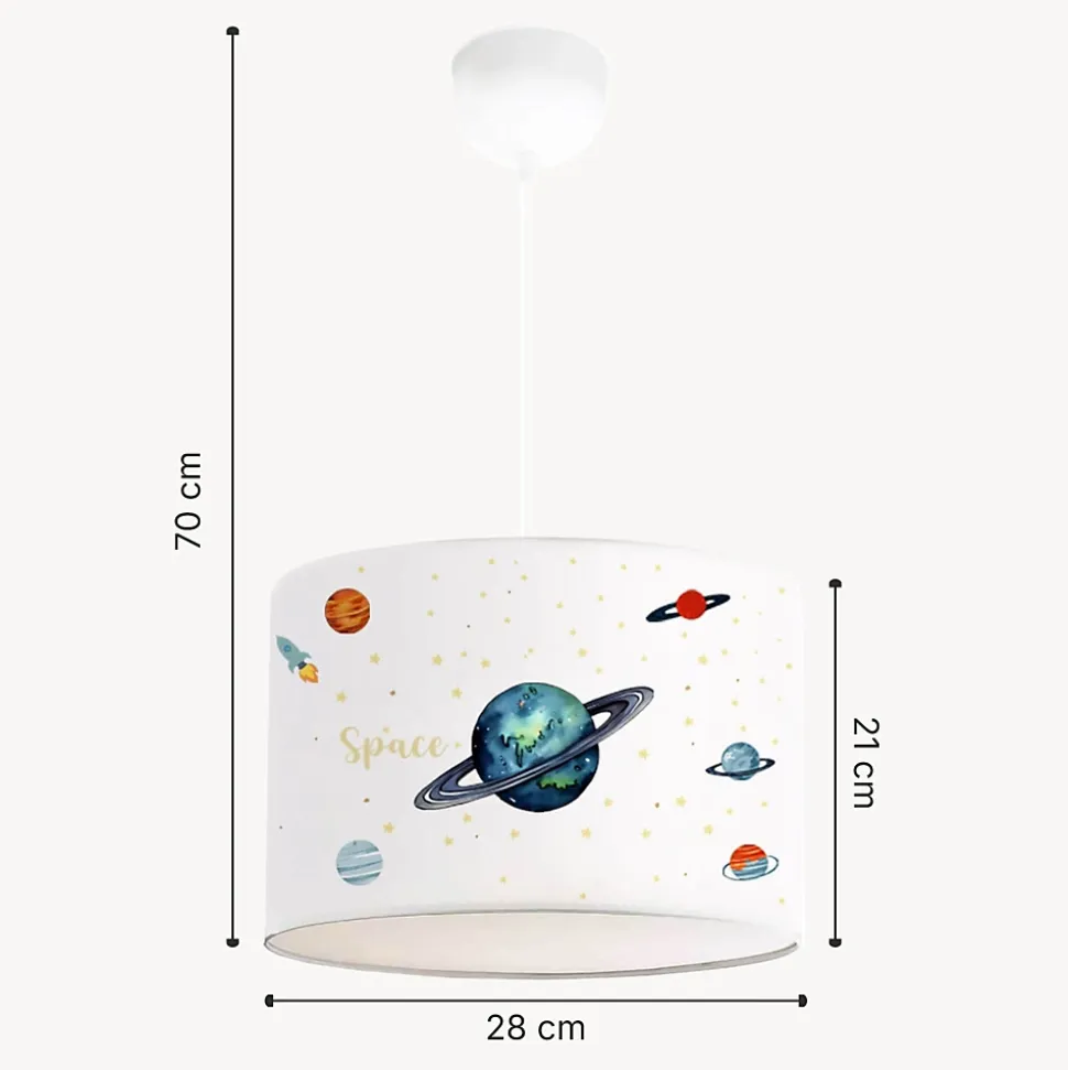 SuspensionCette suspension décorative est le choix idéal pour une chambre d’enfant ou une salle de jeux. Avec son design joyeux et chaleureux, elle diffuse non seulement de la lumière, mais aussi une atmosphère douce et réconfortante dans l’univers des petits.Placée au-dessus du coin jeu, du bureau ou du lit, elle offre un éclairage agréable et adapté aux enfants. Son style harmonieux lui permet de s’intégrer facilement dans toutes les décorations de chambre d’enfant.Le matériel de montage inclus permet une installation rapide et simple au plafond.La suspension est équipée d’un abat-jour orné d’un motif ludique et enfantin. La douille maintient l’ampoule en toute sécurité et assure un éclairage fiable.Points forts :- lampe à suspendre pour enfants conçue avec amour- idéale pour les chambres d’enfants et les salles de jeux- avec une douille pour ampoules LED- réglable en hauteur- montage facile au plafond, matériel de montage inclusCaractéristiques techniques :- douille : 1 x E27, max. 9 W (livrée sans ampoule)- tension : 230 V, 50 Hz- type de protection : classe de protection II- type d’interrupteur : interrupteur muralDimensions :- hauteur : max. 70 cm (réglable en continu lors du montage)- abat-jour (H x Ø) : 21 x 28 cmMatière :- fixation : plastique- abat-jour : PVC + tissu (100 % polyester)Couleur :blancMotif :planèteContenu de la livraison :1 x suspension (ampoules non comprises)Produit de la marque :[lux.pro]