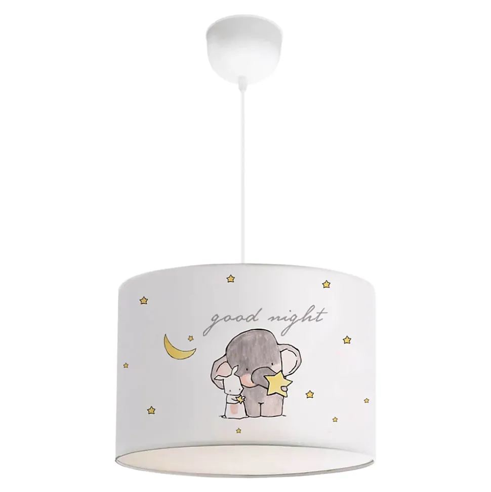 SuspensionCette suspension décorative est le choix idéal pour une chambre d’enfant ou une salle de jeux. Avec son design joyeux et chaleureux, elle diffuse non seulement de la lumière, mais aussi une atmosphère douce et réconfortante dans l’univers des petits.Placée au-dessus du coin jeu, du bureau ou du lit, elle offre un éclairage agréable et adapté aux enfants. Son style harmonieux lui permet de s’intégrer facilement dans toutes les décorations de chambre d’enfant.Le matériel de montage inclus permet une installation rapide et simple au plafond.La suspension est équipée d’un abat-jour orné d’un motif ludique et enfantin. La douille maintient l’ampoule en toute sécurité et assure un éclairage fiable.Points forts :- lampe à suspendre pour enfants conçue avec amour- idéale pour les chambres d’enfants et les salles de jeux- avec une douille pour ampoules LED- réglable en hauteur- montage facile au plafond, matériel de montage inclusCaractéristiques techniques :- douille : 1 x E27, max. 9 W (livrée sans ampoule)- tension : 230 V, 50 Hz- type de protection : classe de protection II- type d’interrupteur : interrupteur muralDimensions :- hauteur : max. 70 cm (réglable en continu lors du montage)- abat-jour (H x Ø) : 21 x 28 cmMatière :- fixation : plastique- abat-jour : PVC + tissu (100 % polyester)Couleur :blancMotif :éléphant + lapinContenu de la livraison :1 x suspension (ampoules non comprises)Produit de la marque :[lux.pro]