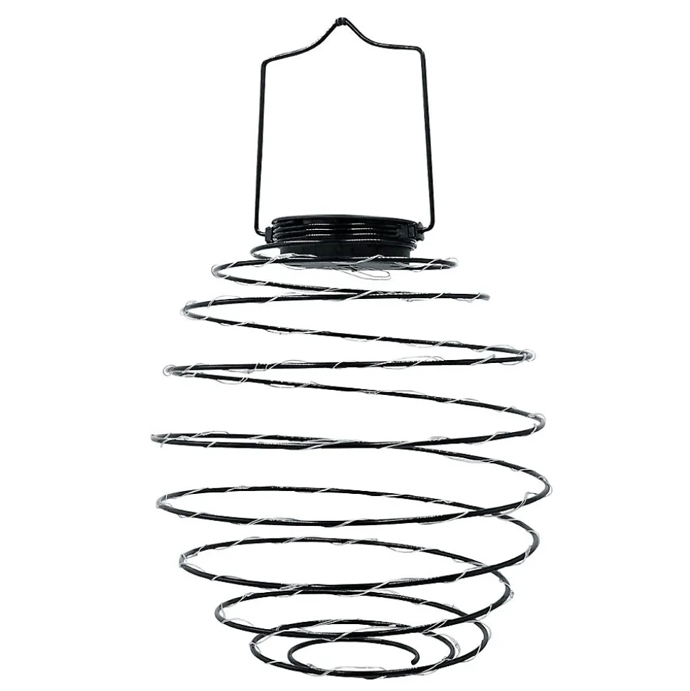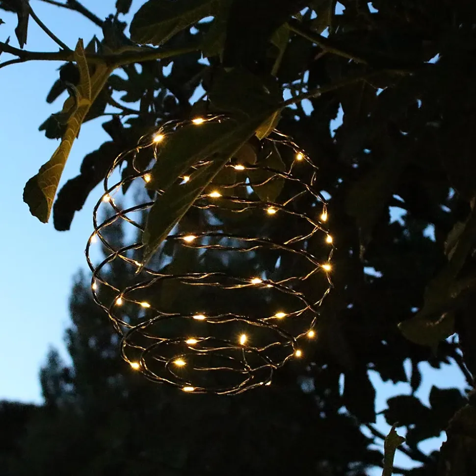 Suspension solaire design spiralé noir acier, micro LED blanc chaud, autonomie jusqu’à 6 heures, protection IP44 contre les éclaboussures, idéale pour éclairage extérieur et intérieur, économe en énergie grâce à la recharge solaire.