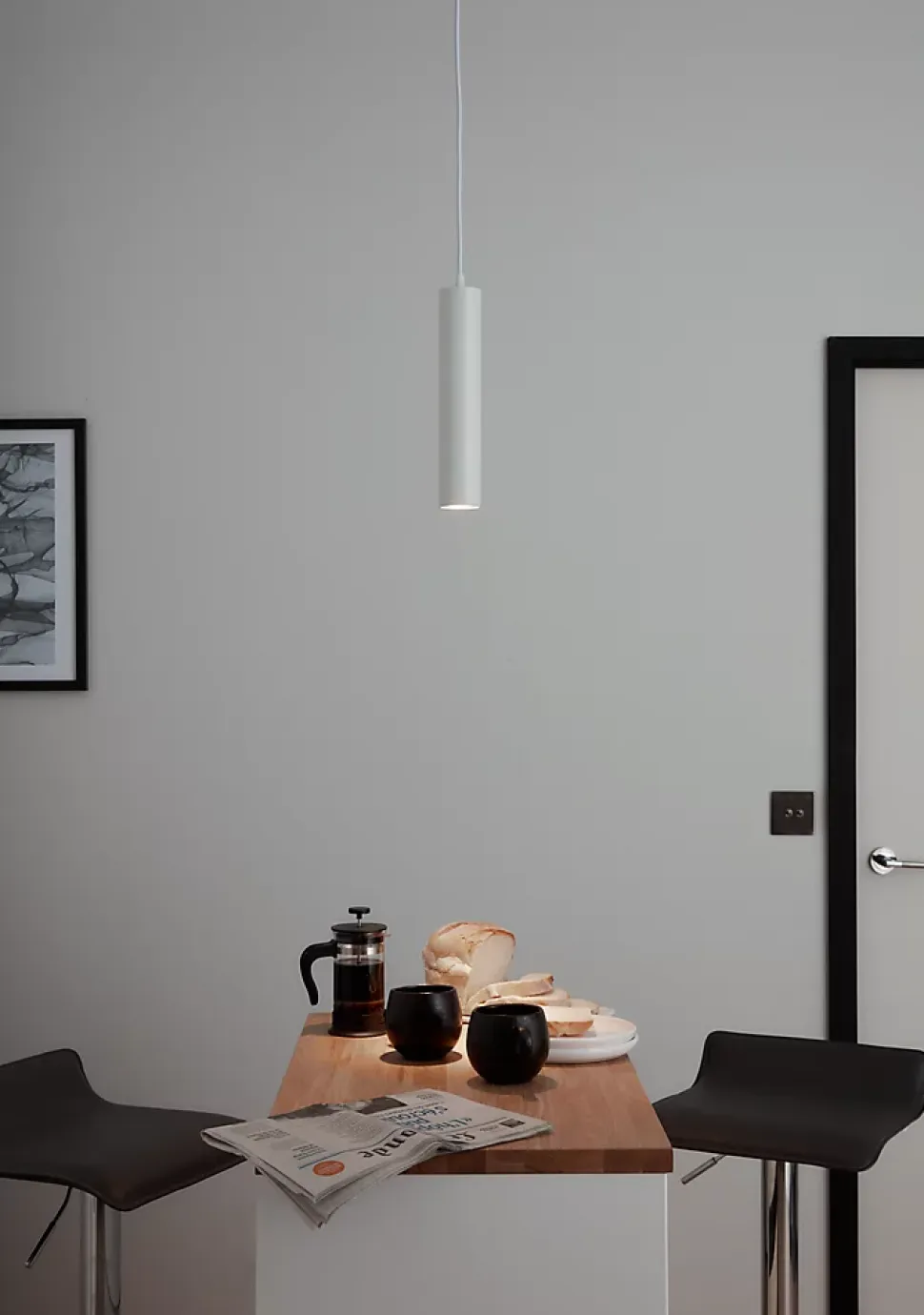 - Parce que la suspension cylindrique permet une diffusion de la lumière vers le bas, elle est parfaite au-dessus d’un bar, d’une table à manger ou dans une petite pièce