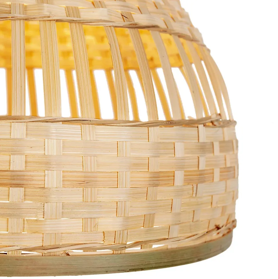 PLAFONNIER EN BAMBOU SUYENPrincipales caractéristiques de la lampe:· Le plafonnier Suyen est fabriqué en bambou, la matière en fibre végétale devenue si tendance dans le secteur de la décoration d’intérieur. En fait, ces types de lampes ont été tissées avec des cannes de bambou faites à la main; Il a une tresse naturelle très attrayante.· La composition avec ce tressage stratégique rend ces lampes résistantes, stables et, en même temps, élastiques.· Elles sont idéales pour une décoration nordique, un courant esthétique qui prône des matériaux naturels qui apportent de la chaleur à l’environnement.· Suyen est une suspension qui donnera un aspect sensationnel à n’importe quelle pièce. Traditionnellement, ces types d’accessoires étaient vus dans les pays asiatiques d’où provenait ce matériau. Cependant, il est maintenant courant de concevoir ces lampes n’importe où et de conserver leur authenticité.· Fabriqué à la main: Cette lampe est fabriquée à la main et c’est pourquoi ses irrégularités font partie de son charme naturel; vous ne verrez pas un luminaire égal à l’autre.· AMPOULE NON INCLUSE· Facile à assembler: le produit comprend un manuel d’instructions très facile à suivre.Dimensions du plafonnier Suyen:· Hauteur: 120 cm· Largeur: 39,5 cm· Profondeur: 39,5 cm· Hauteur du corps de la lampe: 23,5 cm· Poids: 0,43 kg