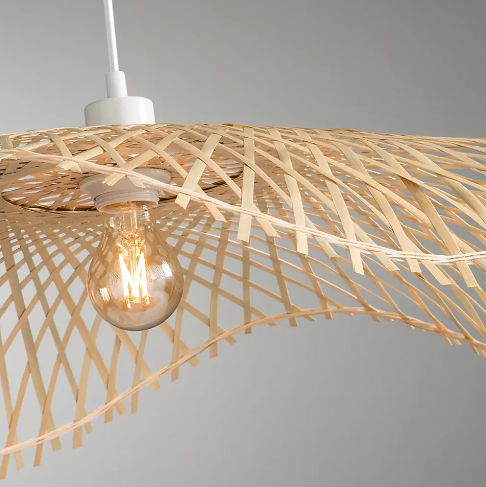 Créez une atmosphère dépaysante dans votre intérieur avec la jolie suspension « Tess » Atmosphera.Une allure naturelleL’abat-jour en bambou de ce plafonnier apportera une dimension authentique à votre décoration. La structure en fer assure une bonne solidité à l’ensemble. Très aérienne, la suspension « Tess » semble venir d’un atelier artisanal d’une contrée lointaine.Un luminaire atypiqueCette décoration de caractère donnera immédiatement une ambiance exotique à une pièce de vie. Sa forme originale se démarquera et vous procurera un incroyable sentiment de bien-être.Si vous êtes adepte des tendances d’ici et d’ailleurs, accrochez la suspension « Tess » au-dessus d’un tapis berbère Atmosphera.Le petit plus décoPour vos envies de voyages, adoptez plusieurs éléments décoratifs qui vous feront rêver : carte du monde, plantes tropicales, toiles imprimées…