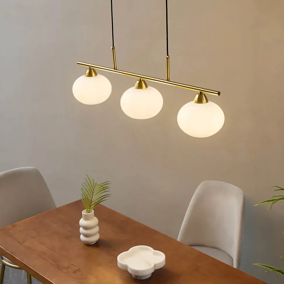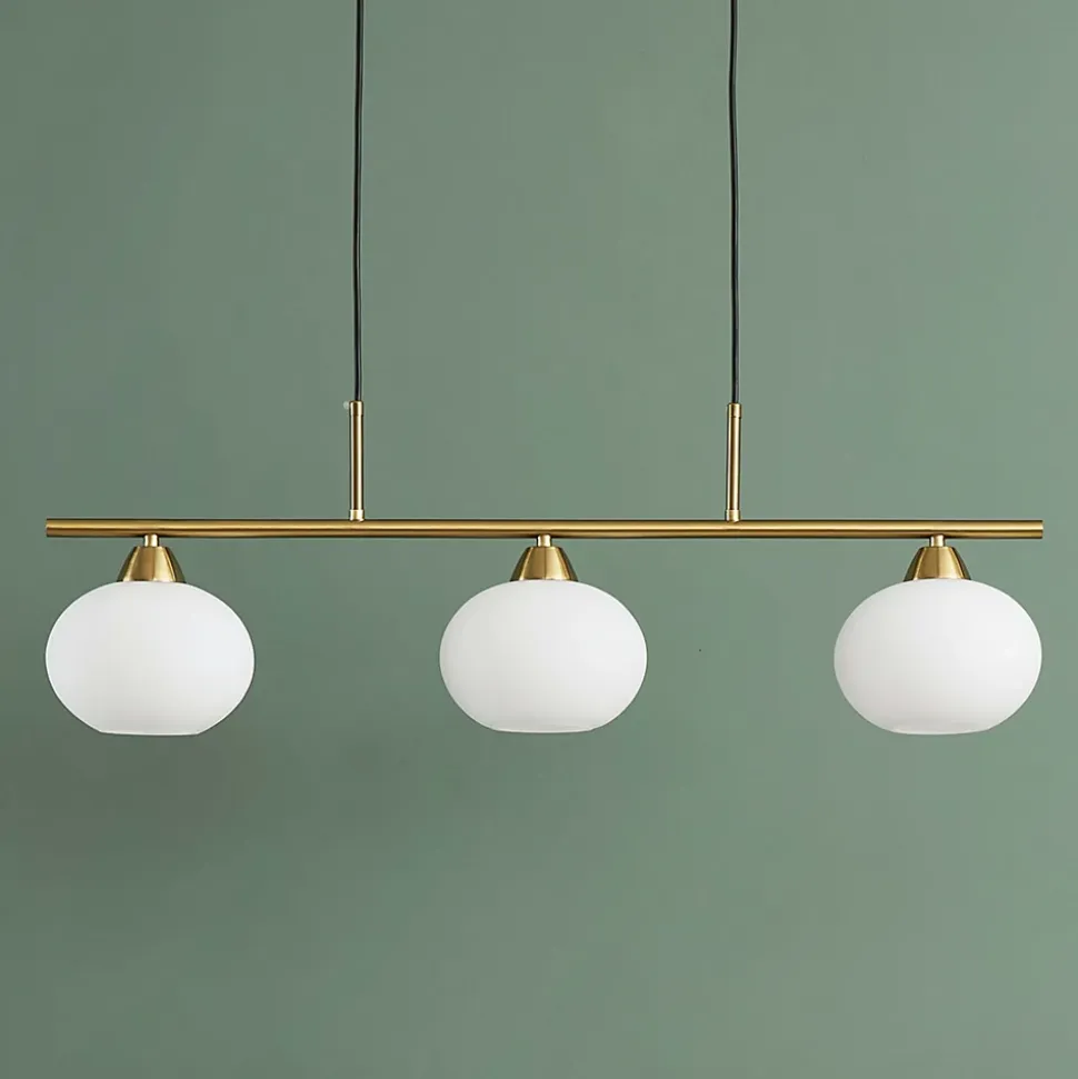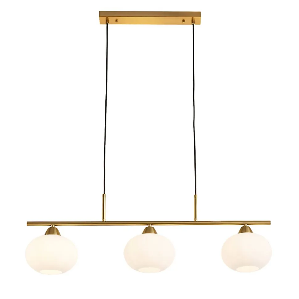 Illuminez votre intérieur avec la suspension Alcyone, qui se distingue par sa structure triple en laiton et ses abat-jours en verre blanc. Ce luminaire diffuse une lumière subtile et raffinée, apportant une touche d’élégance à votre espace. Il fonctionne avec trois ampoules E27 (non incluses) et s’intègre parfaitement au-dessus d’une table à manger ou dans une cuisine moderne, alliant design contemporain et éclairage chaleureux.) Assemblage simple requis (
