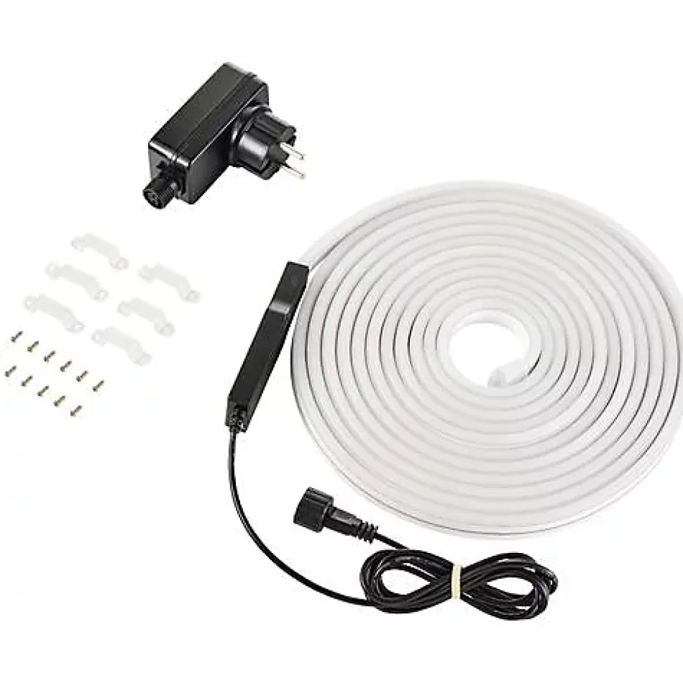 Ruban LED Sygonix SY-4980312, 5 m, alimentation 230 V, puissance 24 W, flux lumineux 450 lm, 700 LED, couleurs RVB et blanc chaud (3000 K). Commande via application Tuya Bluetooth, réglage des couleurs et de la luminosité, modes flash/stroboscope/graduel et synchronisation musicale. Indice de protection IP44, bande flexible en plastique, largeur 18 mm, hauteur 8 mm, courant 0,4 A. Emballage sans plastique, contenu : ruban avec récepteur, 6 clips de fixation, 12 vis, bloc d’alimentation et mode d’emploi. Remarque : ne prend pas en charge le contrôle via le réseau Wi‑Fi Tuya.