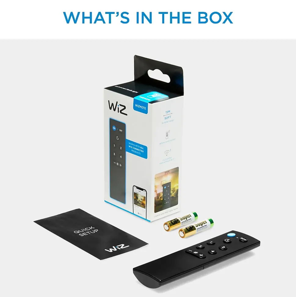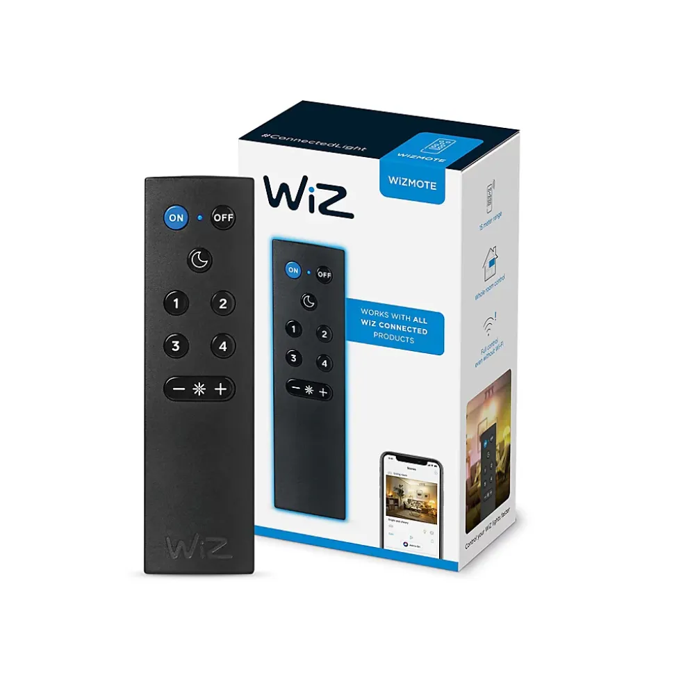 Vos lampes sont faciles et rapides à contrôler avec la WiZmote. Allumage et extinction, réglage de la luminosité, choix du mode veilleuse ou d’un de vos 4 scénarios d’éclairage préférés : il vous suffit simplement d’appuyer sur un bouton. La WiZmote est compatible avec tous les produits connectés WiZ, et peut contrôler toutes les lampes d’une pièce. Sa portée de 15 mètres est impressionnante et elle fonctionne même sans Wi-Fi.