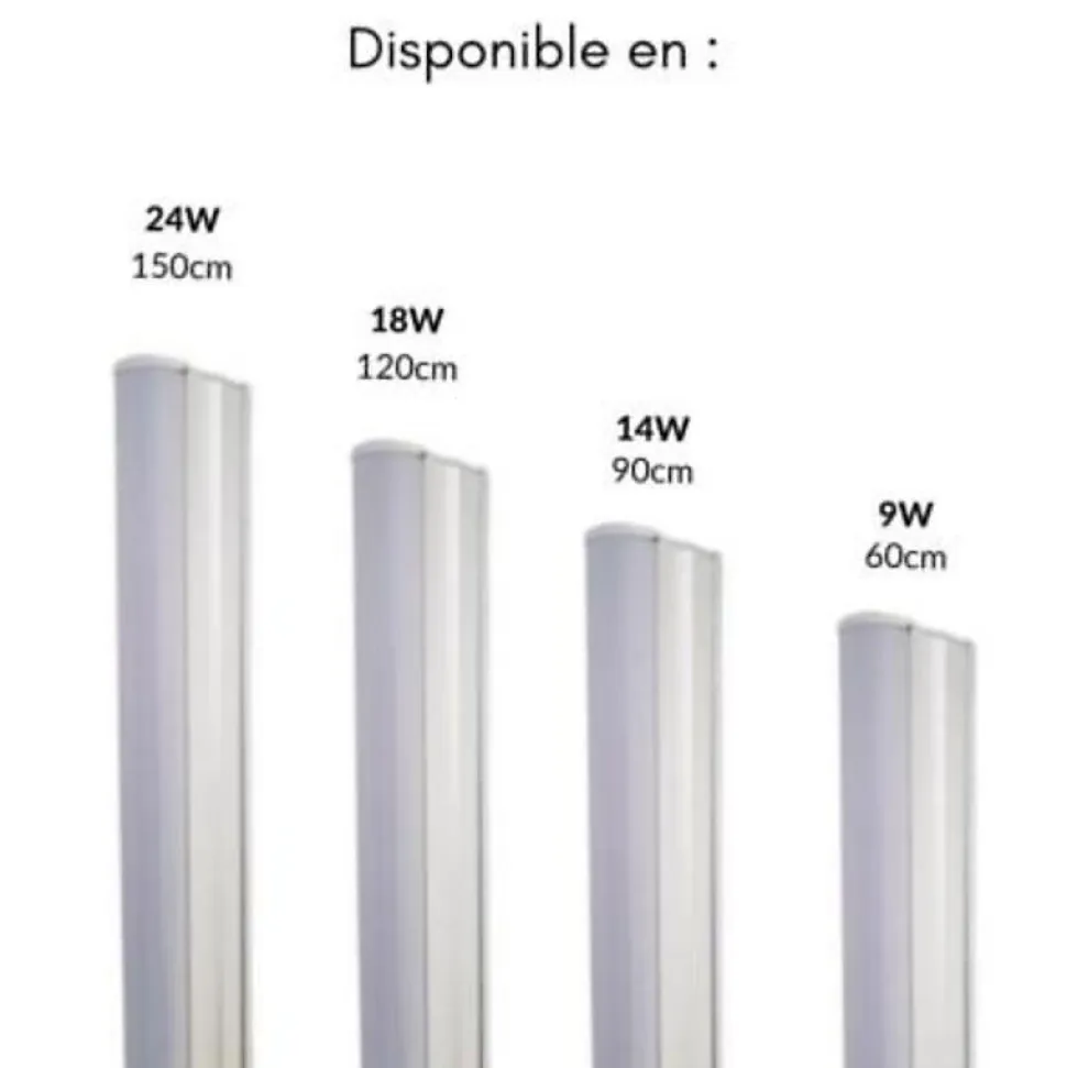 Ce lot de 10 tubes néon LED T5 60cm 9W est la solution idéale pour éclairer plusieurs espaces avec une consommation réduite, une grande fiabilité et une lumière homogène.Spécifications techniques du tube LED 60cm T5 (pack de 10)Chaque tube néon LED de 60 cm de ce pack offre les caractéristiques suivantes :Puissance de 9W par tube, soit 90W au total, pour une consommation minimale.Longueur de 60 cm, idéale pour les meubles, vitrines ou recoins peu accessibles.Trois couleurs de lumière disponibles : blanc chaud, blanc neutre ou blanc froid.Chaque tube délivre 900 lumens, soit un total de 9000 lumens pour le lot.Angle de faisceau de 120°, assurant une belle diffusion lumineuse.Indice IRC ≥ 80, pour une restitution fidèle des couleurs.Durée de vie de 25 000 heures par tube, sans perte de puissance.Indice de protection IP20, pour une utilisation intérieure.Avantages du lot de tubes néon T5 60cm 9WCe pack de tubes LED T5 de 60 cm est pensé pour les utilisateurs qui souhaitent équiper plusieurs points lumineux de manière homogène et rentable. Avec une efficacité énergétique remarquable (100 lm/W), ces tubes offrent un éclairage stable, immédiat et sans scintillement. Leur format compact permet une intégration facile, notamment dans les lieux où l’espace est restreint. Acheter en lot permet aussi de réduire les coûts à l’unité tout en simplifiant les approvisionnements.Installation simplifiée du lot de 10 tubes LEDLa mise en place de ces tubes LED 60cm est simple :Vérifiez la compatibilité de vos luminaires avec les tubes T5.Coupez l’alimentation électrique avant toute opération.Retirez les anciens tubes si pré