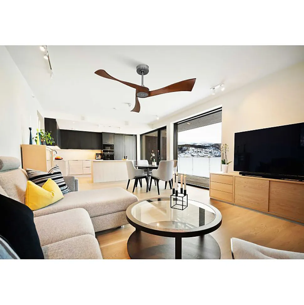 Twist de KlassfanDécouvrez le Twist de Klassfan, un ventilateur de plafond au design moderne, conçu pour offrir des performances de ventilation exceptionnelles grâce à ses pales innovantes. Les pales du Twist sont fortement incurvées avec un angle de « pitch » prononcé, permettant une efficacité optimale même à basse vitesse.Idéal pour les chambres et bureaux, le Twist est conçu pour fonctionner à des vitesses de rotation lentes, garantissant une ventilation douce sans créer de courant d’air excessif. La première vitesse atteint 60 tours par minute et la deuxième 80 tours par minute, avec un niveau sonore inférieur à 28 dB(A), ce qui en fait l’un des ventilateurs les plus silencieux du marché. Pour une ventilation plus intense, les vitesses peuvent monter jusqu’à 170 tours par minute.Équipé du système FullFlow de Klassfan, le Twist ajuste la puissance du moteur en fonction des besoins, permettant d’augmenter la puissance de 15% jusqu’à trois fois. Le moteur Ouray offre une puissance variable de 14 à 50 watts, avec une consommation énergétique minimale de 4.2 watts à 26 watts à pleine vitesse en programme 3 du FullFlow.Fonctionnalités avancées :Le Twist est doté de fonctionnalités avancées telles qu’un thermostat intégré, une connectivité Wifi programmable avec scénarios, une fonction de super déstratificateur, et une télécommande RF. En option, ajoutez le Thermafeel, un thermostat déporté, et un boîtier de commande mural pour une gestion thermique optimale.Caractéristiques : Surface de portée : mode déstratificateur 60 à 90 m² – mode ventilation de
