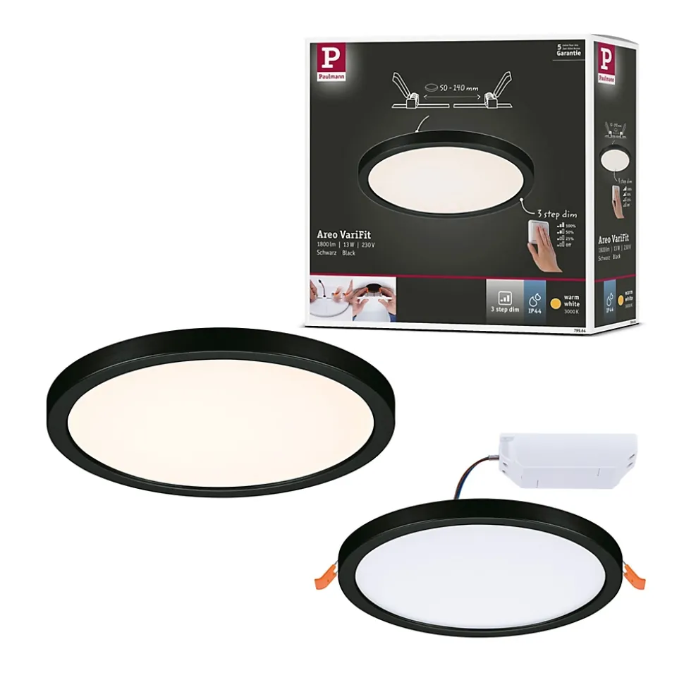 VariFit : montage facile avec des ressorts de serrage à ajustement sans paliers|Un simple commutateur permet de faire varier la luminosité sur 3 niveaux|Avec ampoule LED intégrée|En plastique facile d’entretien|Pour raccordement direct au secteur 230V|Protection IP : IP44 – Protection contre les projections d’eau