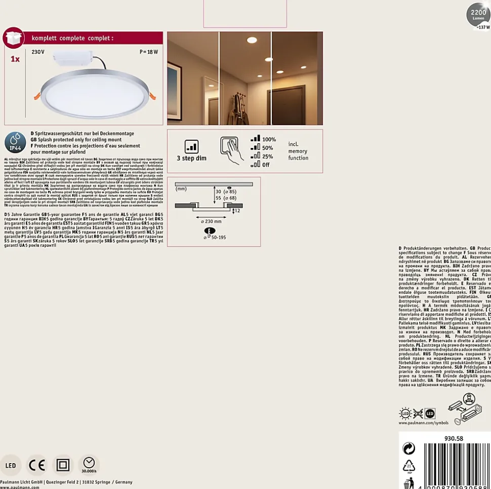 Le panneau encastré rond Areo avec un diamètre de 230 mm et une puissance de 16 watts en Chrome mat fournit une lumière étendue blanc neutre. Grâce à la technologie VariFit flexible, les ressorts de serrage pour le montage sont réglables en continu entre 50 et 195 mm. Le panneau peut ainsi être encastré dans des trous de perçage déjà présents ou dans de nouveaux trous avec couronne de forage standard. Avec sa fonction intégrée gradable sur 3 niveaux, il offre trois intensités de lumière en actionnant plusieurs fois un simple commutateur traditionnel. La fonction Mémoire enregistre le dernier niveau d’intensité sélectionné jusqu’à la prochaine utilisation.Pour un diamètre d’alésage supérieur à 85 mm, une profondeur de cavité d’au moins 30 mm est requise et pour un diamètre supérieur à 68 mm, une profondeur d’au moins 55 mm est requise.