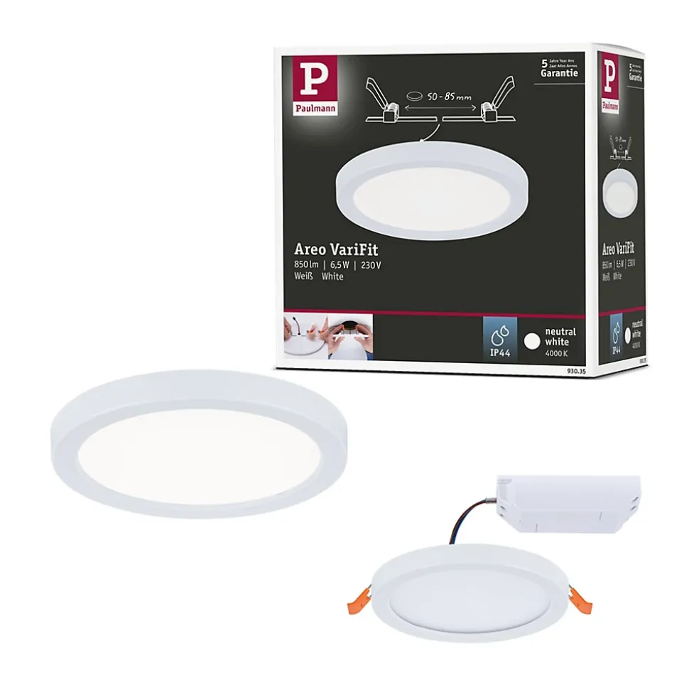Le panneau encastré rond Areo avec un diamètre de 118 mm et une puissance de 6,5 watts en Blanc fournit une lumière étendue blanc neutre. Grâce à la technologie VariFit flexible, les ressorts de serrage pour le montage sont réglables en continu entre 50 et 85 mm. Le panneau peut ainsi être encastré dans des trous de perçage déjà présents ou dans de nouveaux trous avec couronne de forage standard.Pour un diamètre d’alésage supérieur à 85 mm, une profondeur de cavité d’au moins 30 mm est requise et pour un diamètre supérieur à 68 mm, une profondeur d’au moins 55 mm est requise.