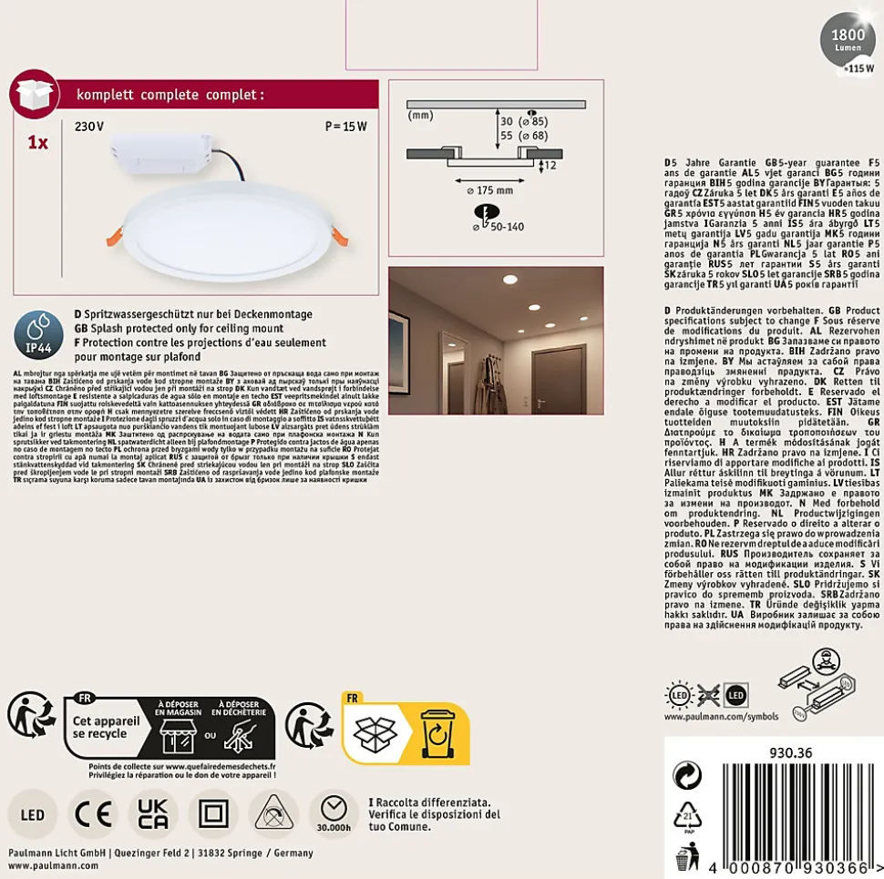 VariFit : montage facile avec des ressorts de serrage à ajustement sans paliers|Avec ampoule LED intégrée|En plastique facile d’entretien|Température de couleur: 4000K – Blanc neutre|Pour raccordement direct au secteur 230V|Protection IP : IP44 – Protection contre les projections d’eau