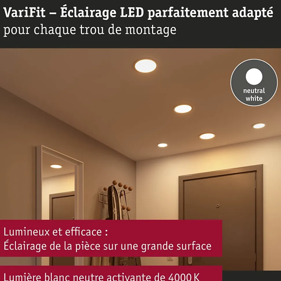 VariFit : montage facile avec des ressorts de serrage à ajustement sans paliers|Avec ampoule LED intégrée|En plastique facile d’entretien|Température de couleur: 4000K – Blanc neutre|Pour raccordement direct au secteur 230V|Protection IP : IP44 – Protection contre les projections d’eau