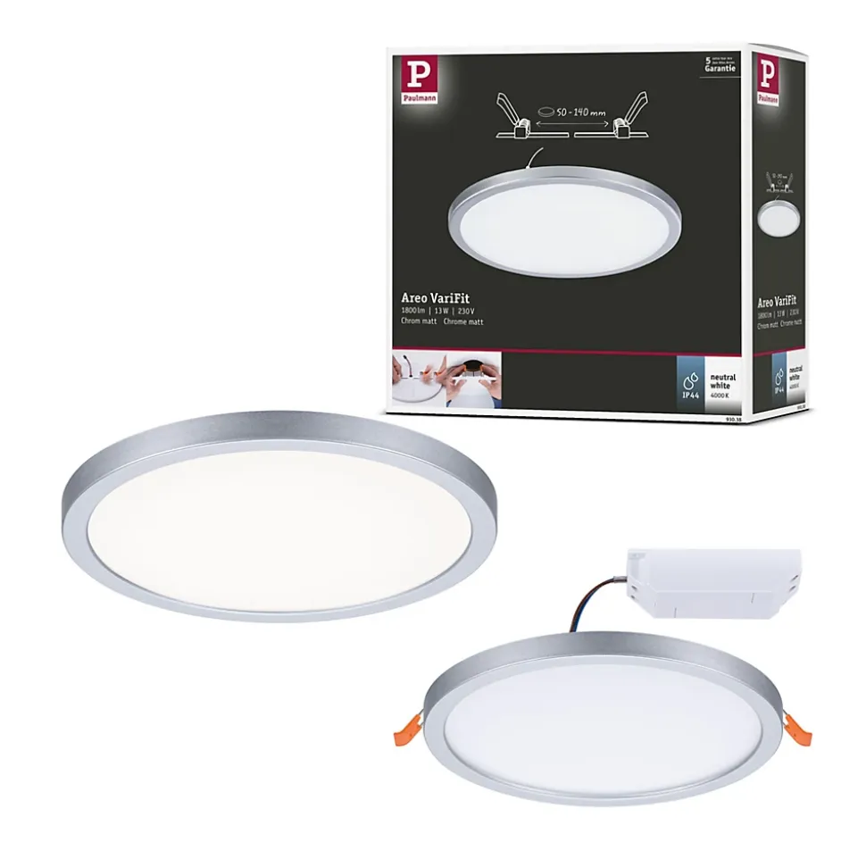 Le panneau encastré rond Areo avec un diamètre de 175 mm et une puissance de 13 watts en Chrome mat fournit une lumière étendue blanc neutre. Grâce à la technologie VariFit flexible, les ressorts de serrage pour le montage sont réglables en continu entre 50 – 140 mm. Le panneau peut ainsi être encastré dans des trous de perçage déjà présents ou dans de nouveaux trous avec couronne de forage standard.Pour un diamètre d’alésage supérieur à 85 mm, une profondeur de cavité d’au moins 30 mm est requise et pour un diamètre supérieur à 68 mm, une profondeur d’au moins 55 mm est requise.