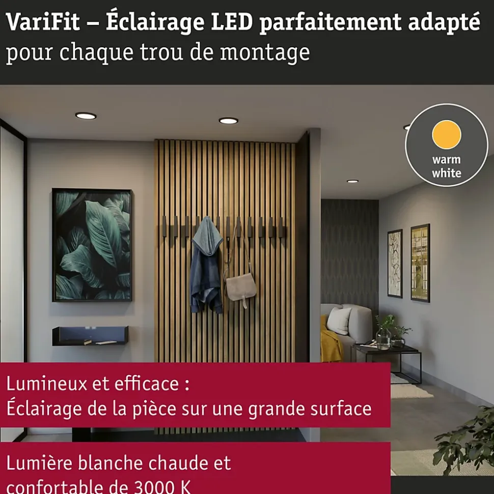VariFit : montage facile avec des ressorts de serrage à ajustement sans paliers|Avec ampoule LED intégrée|En plastique facile d’entretien|Pour raccordement direct au secteur 230V|Protection IP : IP44 – Protection contre les projections d’eau