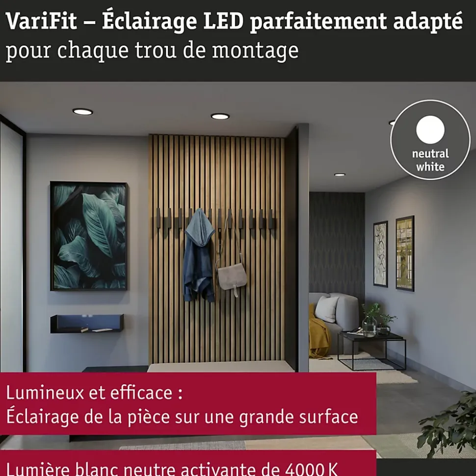 VariFit : montage facile avec des ressorts de serrage à ajustement sans paliers|Avec ampoule LED intégrée|En plastique facile d’entretien|Température de couleur: 4000K – Blanc neutre|Pour raccordement direct au secteur 230V|Protection IP : IP44 – Protection contre les projections d’eau