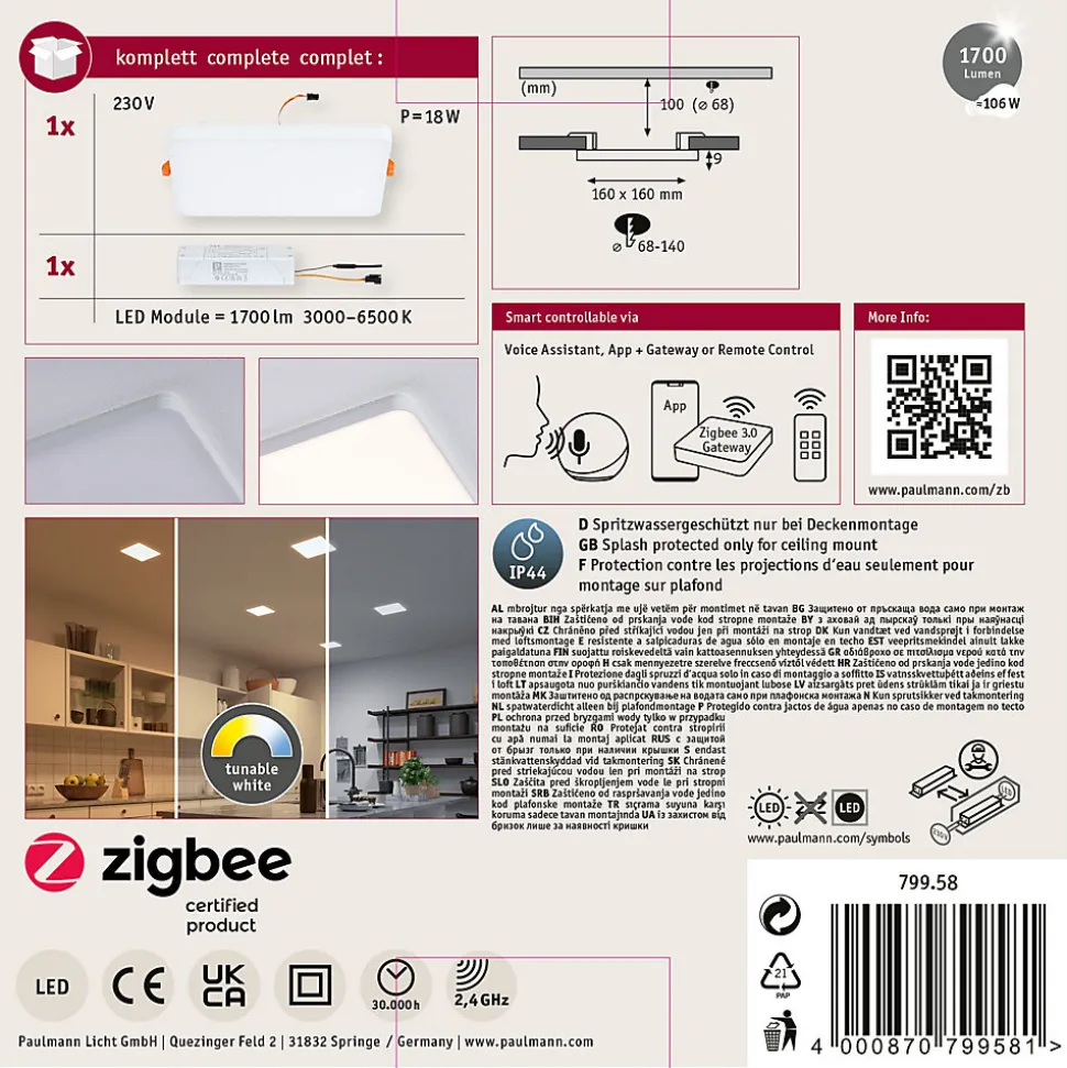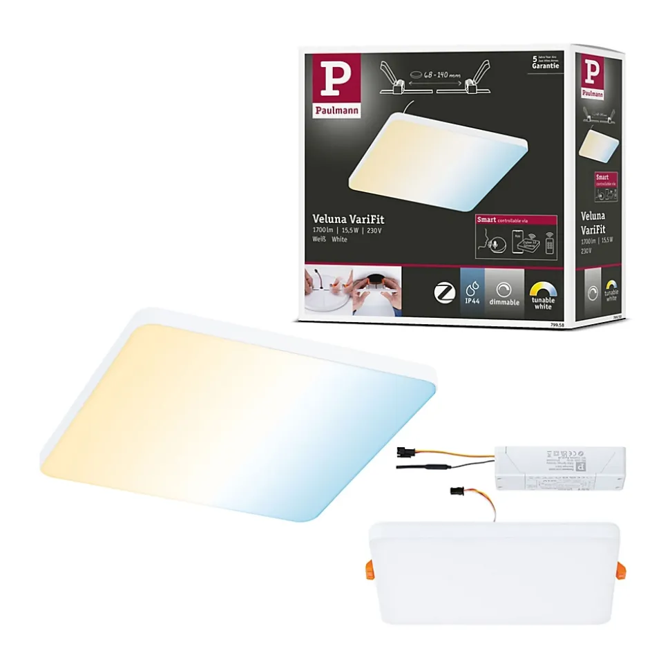 Le panneau encastré de forme carrée Veluna VariFit Edge impressionne par son design moderne et sans cadre. De dimension 160×160 mm, le panneau assure un rendement lumineux élevé et uniforme. Grâce à la technologie VariFit flexible, les ressorts de serrage pour le montage sont réglables en continu entre 68 et 140 mm. Le panneau peut ainsi être encastré dans des trous de perçage déjà présents ou dans de nouveaux trous. Pour un diamètre d’alésage supérieur à 68 mm, une profondeur de cavité d’au moins 100 mm est requise. Le couvercle en plastique satiné crée une fine diffusion de la lumière. Grâce à la commande de lumière blanche intelligente Tunable White, vous réglez en continu et personnalisez la température de couleur du luminaire – du blanc lumière du jour de l’éclairage de travail jusqu’au blanc chaud de la lumière de relaxation. Le luminaire est compatible Zigbee 3.0 3.0. Zigbee 3.0 est un protocole de transmission radio qui met en réseau les appareils de différents fabricants.