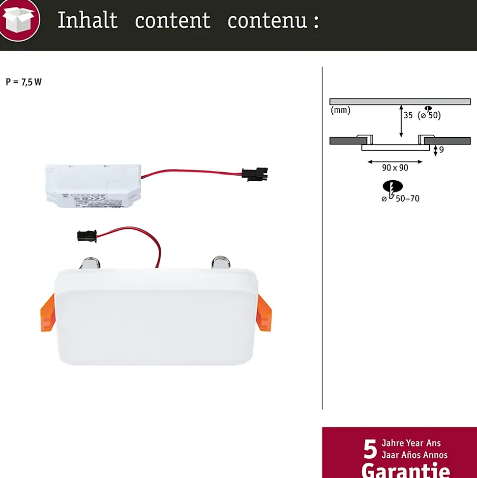 Le panneau encastré de forme carrée Veluna VariFit Edge gradable impressionne par son design moderne et sans cadre dans un Blanc discret. Avec des dimensions de 90×90 mm et une température de couleur de 3000K, le panneau assure un rendement lumineux élevé et uniforme. Grâce à la technologie VariFit flexible, les ressorts de serrage pour le montage sont réglables en continu entre 50 et 70 mm. Le panneau peut ainsi être encastré dans des trous de perçage déjà présents ou dans de nouveaux trous. Pour un diamètre d’alésage supérieur à 50 mm, une profondeur de cavité d’au moins 35 mm est requise. Le couvercle en plastique satiné crée une fine diffusion de la lumière et une lumière d’un blanc chaud rayonnant et chaleureux, qui est personnalisable grâce à la fonction de gradation.