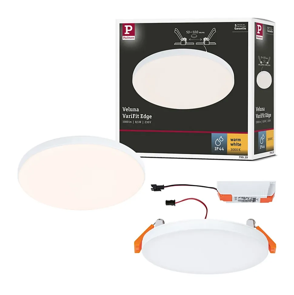Design particulièrement plat|Température de couleur: 3000K – Blanc chaud|Éclairage de pièce uniforme sur la base de la technologie LED la plus récente|Rendement lumineux élevé pour une lumière longue portée|Protection contre les projections d’eau IP44, pour salle de bains|Cache en plastique satiné pour une diffusion subtile de la lumière|VariFit : montage facile avec des ressorts de serrage à ajustement sans paliers|Avec ampoule LED intégrée|Durée de vie de 50 000 heures