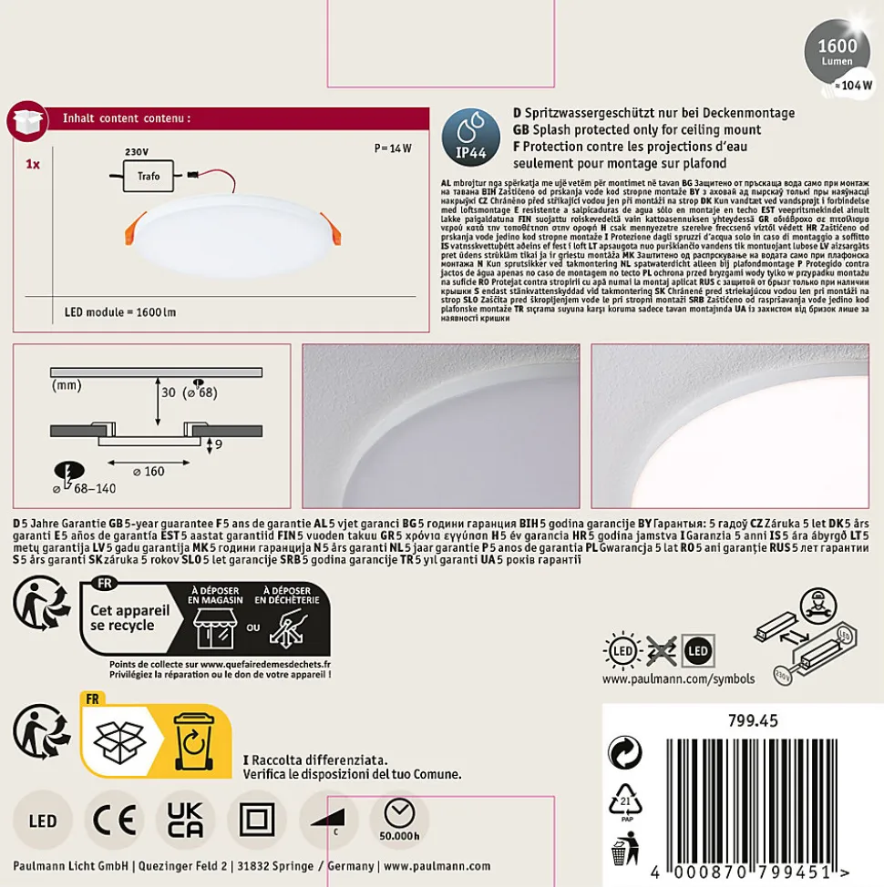 Design particulièrement plat|Température de couleur: 3000K – Blanc chaud|Éclairage de pièce uniforme sur la base de la technologie LED la plus récente|Rendement lumineux élevé pour une lumière longue portée|Protection contre les projections d’eau IP44, pour salle de bains|Cache en plastique satiné pour une diffusion subtile de la lumière|VariFit : montage facile avec des ressorts de serrage à ajustement sans paliers|Avec ampoule LED intégrée|Durée de vie de 50 000 heures|Intensité variable
