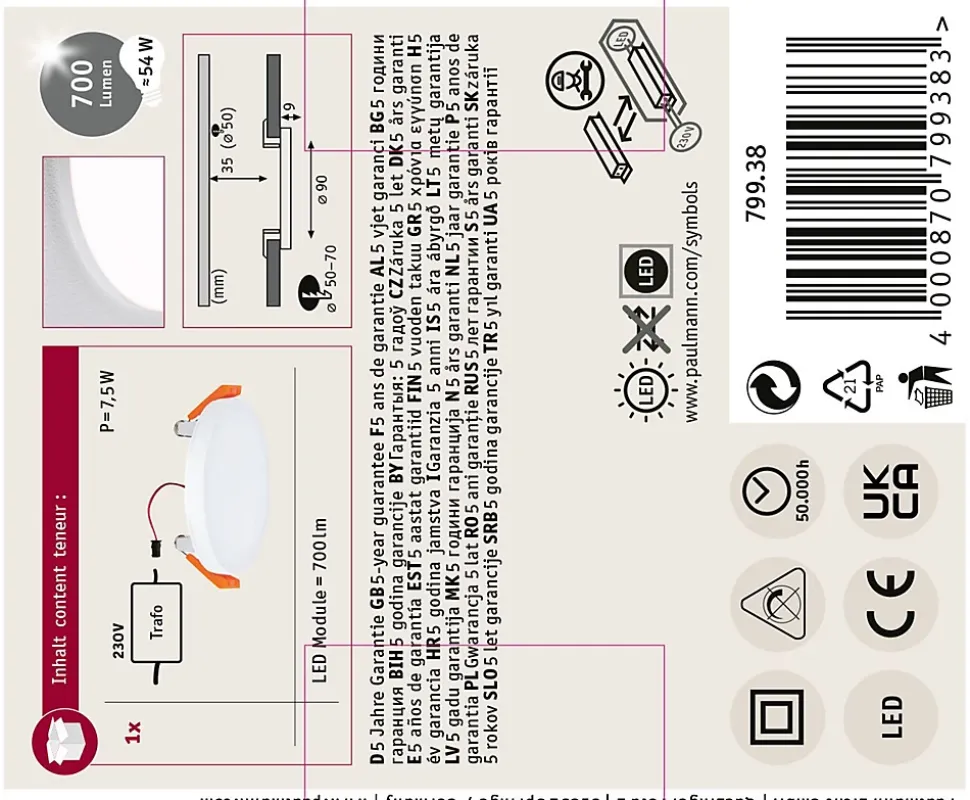 Design particulièrement plat|Température de couleur: 3000K – Blanc chaud|Éclairage de pièce uniforme sur la base de la technologie LED la plus récente|Rendement lumineux élevé pour une lumière longue portée|Protection contre les projections d’eau IP44, pour salle de bains|Cache en plastique satiné pour une diffusion subtile de la lumière|VariFit : montage facile avec des ressorts de serrage à ajustement sans paliers|Avec ampoule LED intégrée|Durée de vie de 50 000 heures