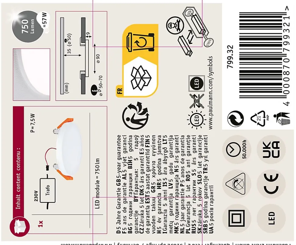 Design particulièrement plat|Température de couleur: 4000K – Blanc neutre|Éclairage de pièce uniforme sur la base de la technologie LED la plus récente|Rendement lumineux élevé pour une lumière longue portée|Protection contre les projections d’eau IP44, pour salle de bains|Cache en plastique satiné pour une diffusion subtile de la lumière|VariFit : montage facile avec des ressorts de serrage à ajustement sans paliers|Avec ampoule LED intégrée|Durée de vie de 50 000 heures