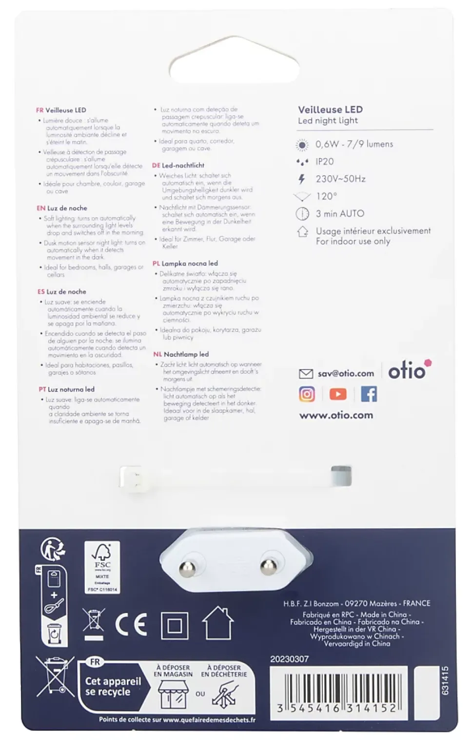 Veilleuse 2 en 1 crépusculaire à détection LED intégrée blanc neutre IP20 0,6W l.2,3xH.11,5cm Otio