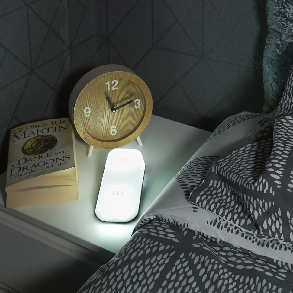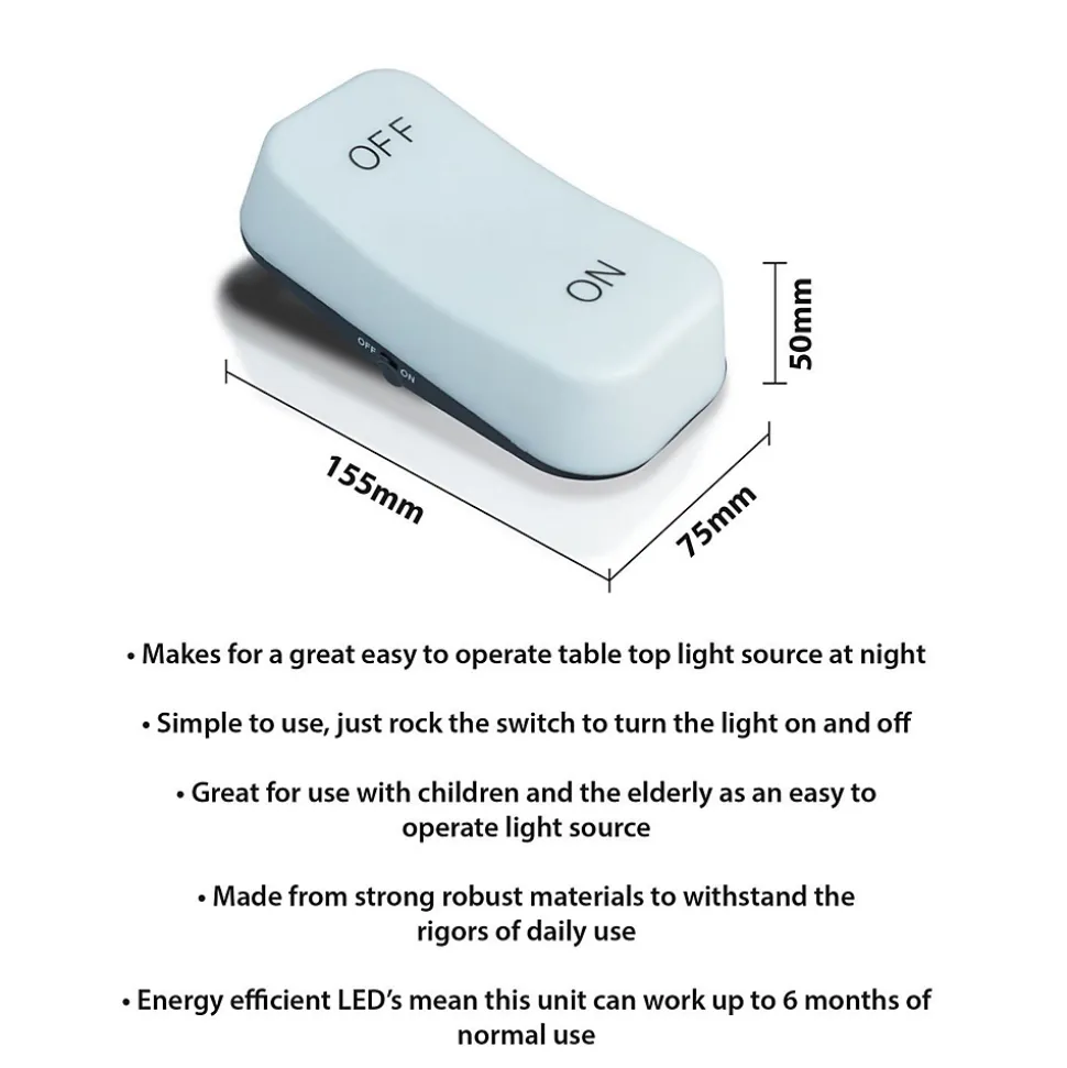 Veilleuse à bascule de table St Helens Home and Garden fonctionnant sur piles (3 x AA non fournies). Basculez simplement le corps de la lumière pour l’allumer ou l’éteindre. Idéal pour une utilisation la nuit sur les tables d’appoint de la chambre pour donner une quantité généreuse de lumière.LUMIÈRE DE NUIT : constitue une excellente source de lumière de table facile à utiliser la nuit.SIMPLE À UTILISER : il suffit de basculer l’interrupteur pour allumer la lumière.SÉCURITÉ : Idéal pour une utilisation avec les enfants et les personnes âgées comme source de lumière facile à utiliserROBUSTE : Fabriqué à partir de matériaux solides et robustes pour résister aux rigueurs de la vie quotidienne.LONGUE DURÉE DE VIE : Les LED économes en énergie signifient que cet appareil peut fonctionner jusqu’à 6 mois d’utilisation normaleBatteries: 3x AA (non inclus)Couleur: BlancNombre de LED: 8Taper: détecteur de gravitéDimensions du produit (mm): 50x75x155Poids net / kg): 0,07…