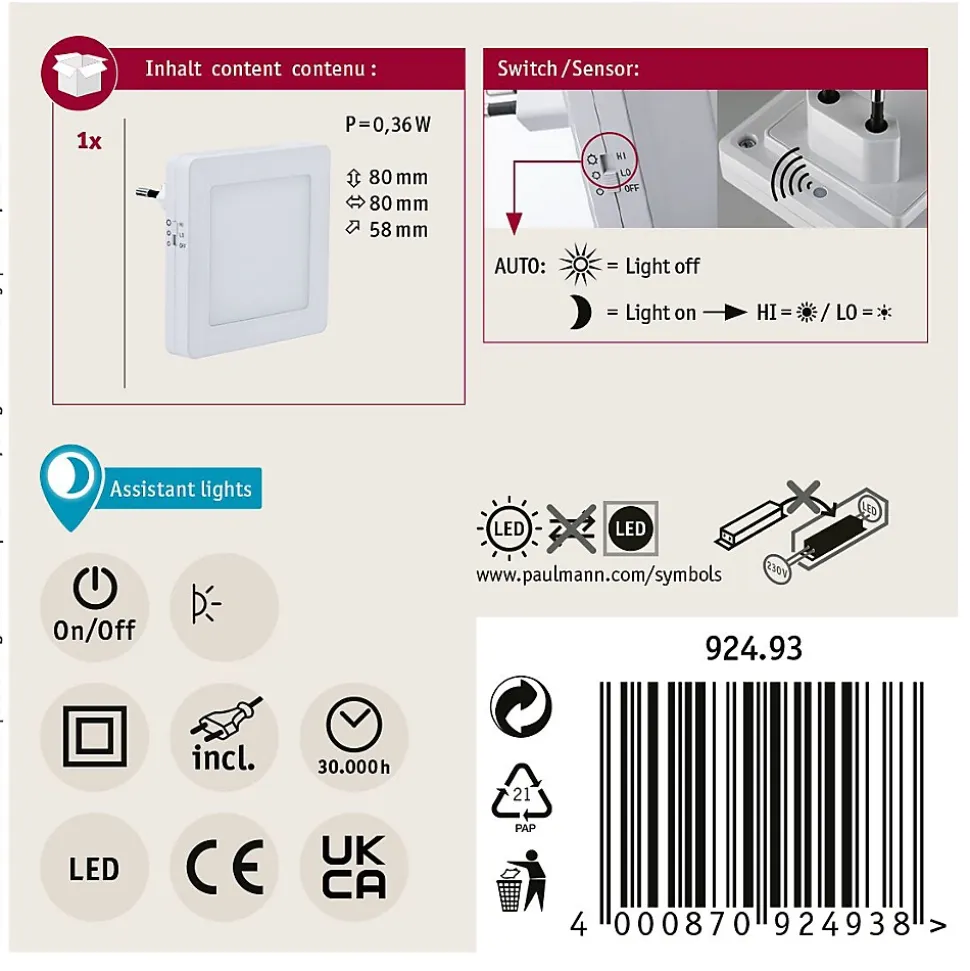 La veilleuse sur prise Esby procure un agréable éclairage blanc chaud et permet de s’orienter dans l’obscurité. Elle est donc optimale dans les chambres à coucher et chambres d’enfants ou dans les couloirs sombres. Il suffit de la brancher sur une prise et c’est tout. Elle est dotée de deux niveaux de réglage de luminosité. Au crépuscule, les luminaires se mettent en marche automatiquement grâce au capteur crépusculaire intégré.