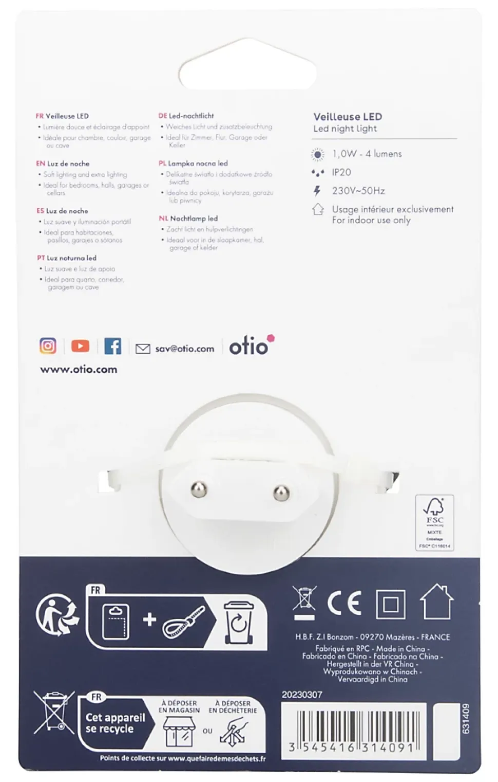 - Technologie LED, pas d’ampoule à changer, faible consommation (1W)